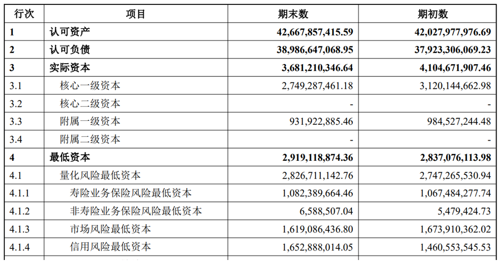 从公开数据来看,2025年四季度末公司实际资本为36.81亿元,较上一季度的41.05亿元减少4.24亿元,降幅达10.33%。核心一级资本从31.20亿元降至27.49亿元,减少3.71亿元;附属一级资本从9.85亿元降至9.32亿元,减少0.53亿元。实际资本的收缩,直接削弱了公司的风险抵御能力,而保单盈余的减少,本质上与公司经营业绩不佳、保费收入增速放缓、投资收益不及预期密切相关。