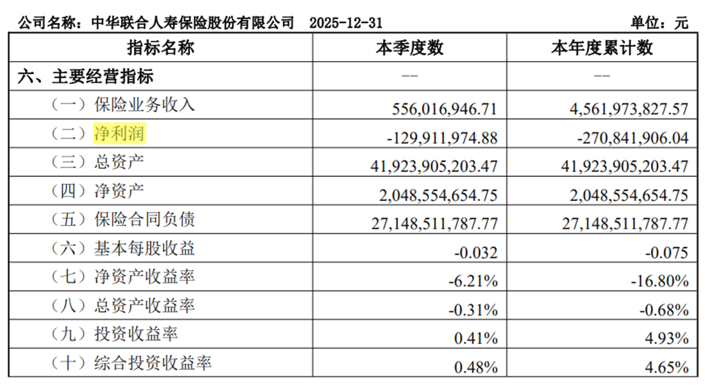 2025年四季度,中华人寿净利润为-1.30亿元,全年累计净利润为-2.71亿元,较2024年全年亏损的4.94亿元有所收窄,但亏损态势未得到根本扭转。这已是中华人寿自2015年成立以来的第九年连续亏损。