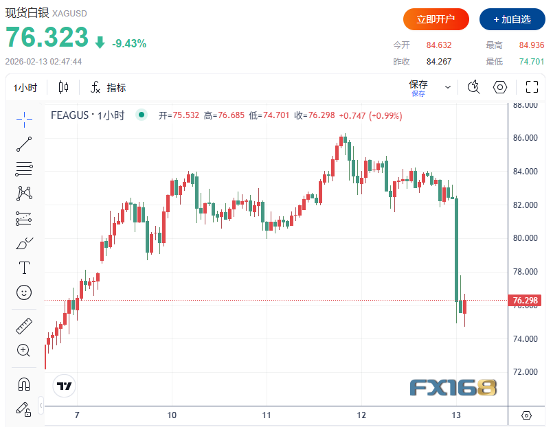 现货白银日内大跌约11%,触及74.701美元/盎司低点。