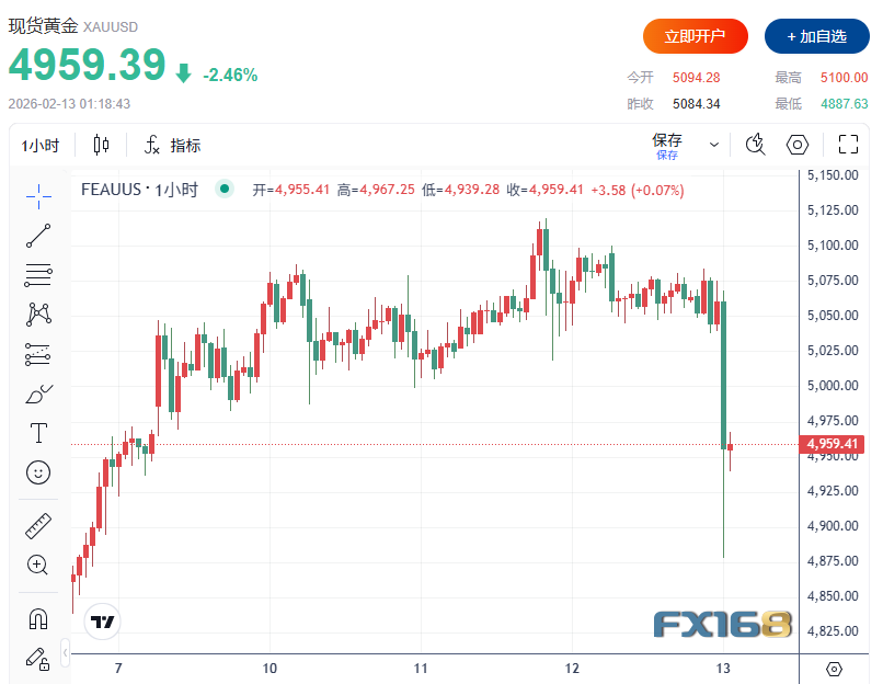 FX168财经报社(北美)讯 周四(2月12日),国际金价盘中大幅走低。美国最新一轮强劲劳动力数据进一步削弱市场对美联储短期内降息的押注,令无息资产黄金承压;不过,美国与伊朗之间的地缘政治紧张升级,仍在一定程度上提供避险需求支撑,使多空因素在盘面上形成拉锯。