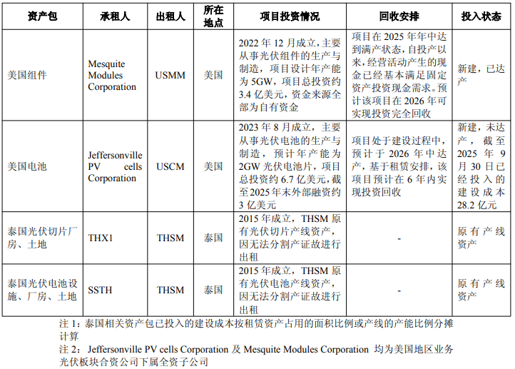 为满足相关法案要求及保障美国地区业务正常运营,阿特斯已在2025年12月31日前,完成了美国德克萨斯州5GW光伏组件工厂;美国印第安纳州2GW光伏电池工厂;泰国春武里府光伏切片厂房、土地;泰国春武里府光伏电池设施、厂房、土地四份租赁合同的签署。