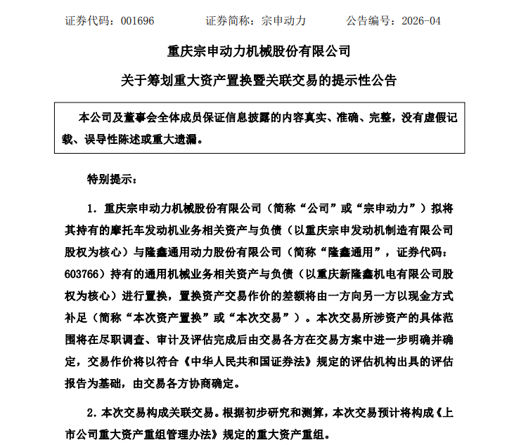 2月13日晚,宗申动力(001696)发布公告称,公司正筹划与隆鑫通用(603766)进行资产置换,拟以所持摩托车发动机业务相关资产与负债,置换隆鑫通用所持通用机械业务相关资产与负债,本次交易预计构成重大资产重组。