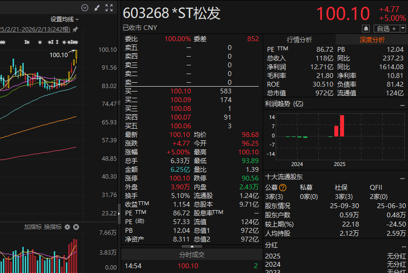2月13日,*ST松发股价在下午时段封住涨停,截至收盘报100.1元/股。