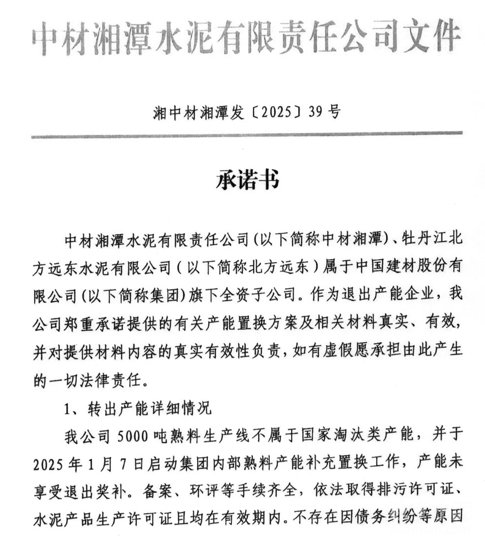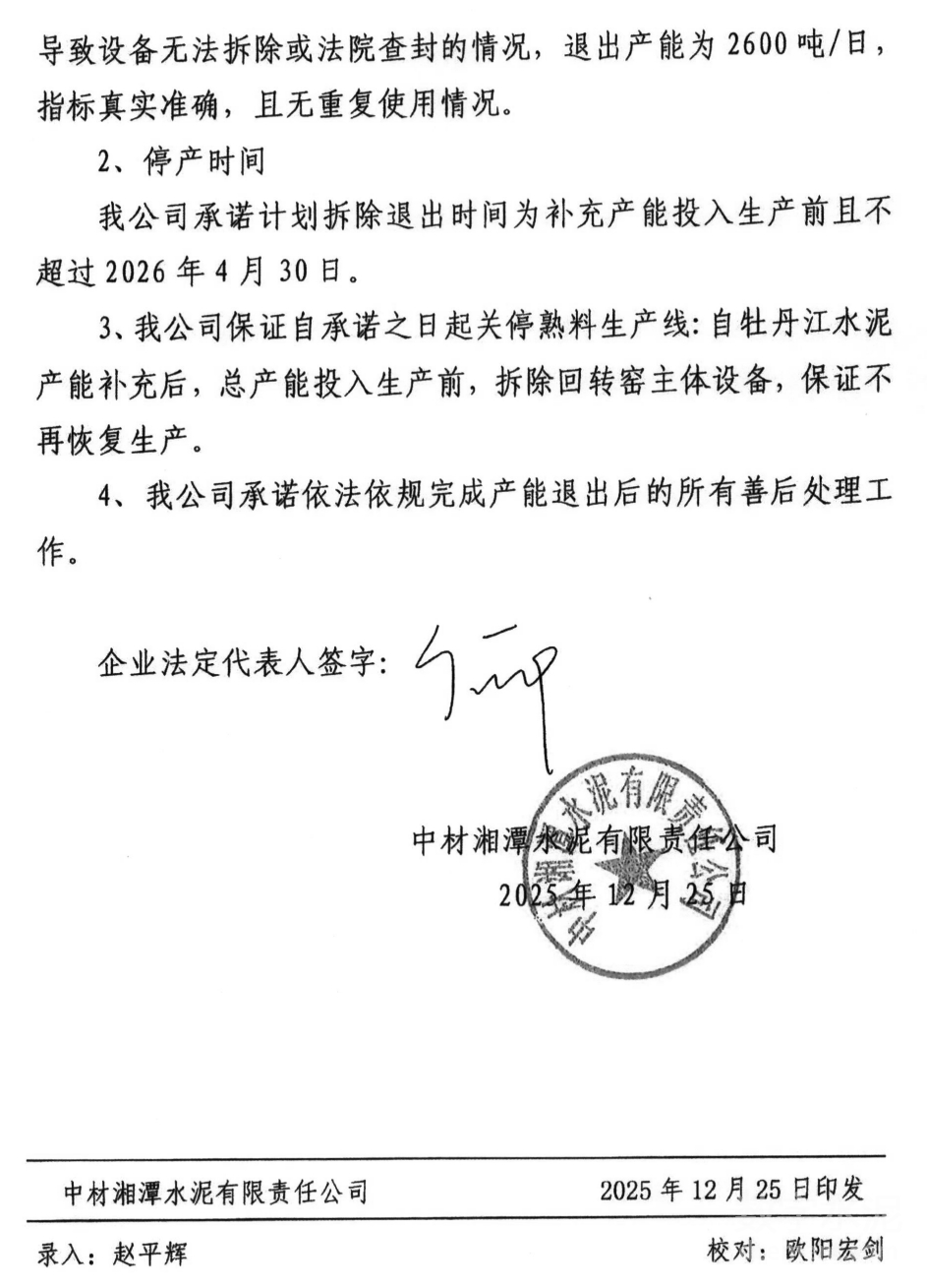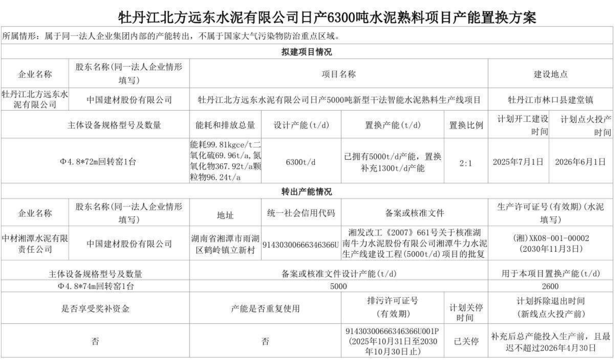 牡丹江北方远东水泥有限公司5000t/d新型干法智能水泥熟料线已拥有5000t/d产能,置换补充1300t/d产能,置换比例为2:1。中材湘潭水泥有限责任公司一条5000t/d水泥熟料线中的2600t/d用于本项目置换产能,该生产线计划补充过后总产能投入生产前,且最迟不超过2026年4月30日拆除退出。