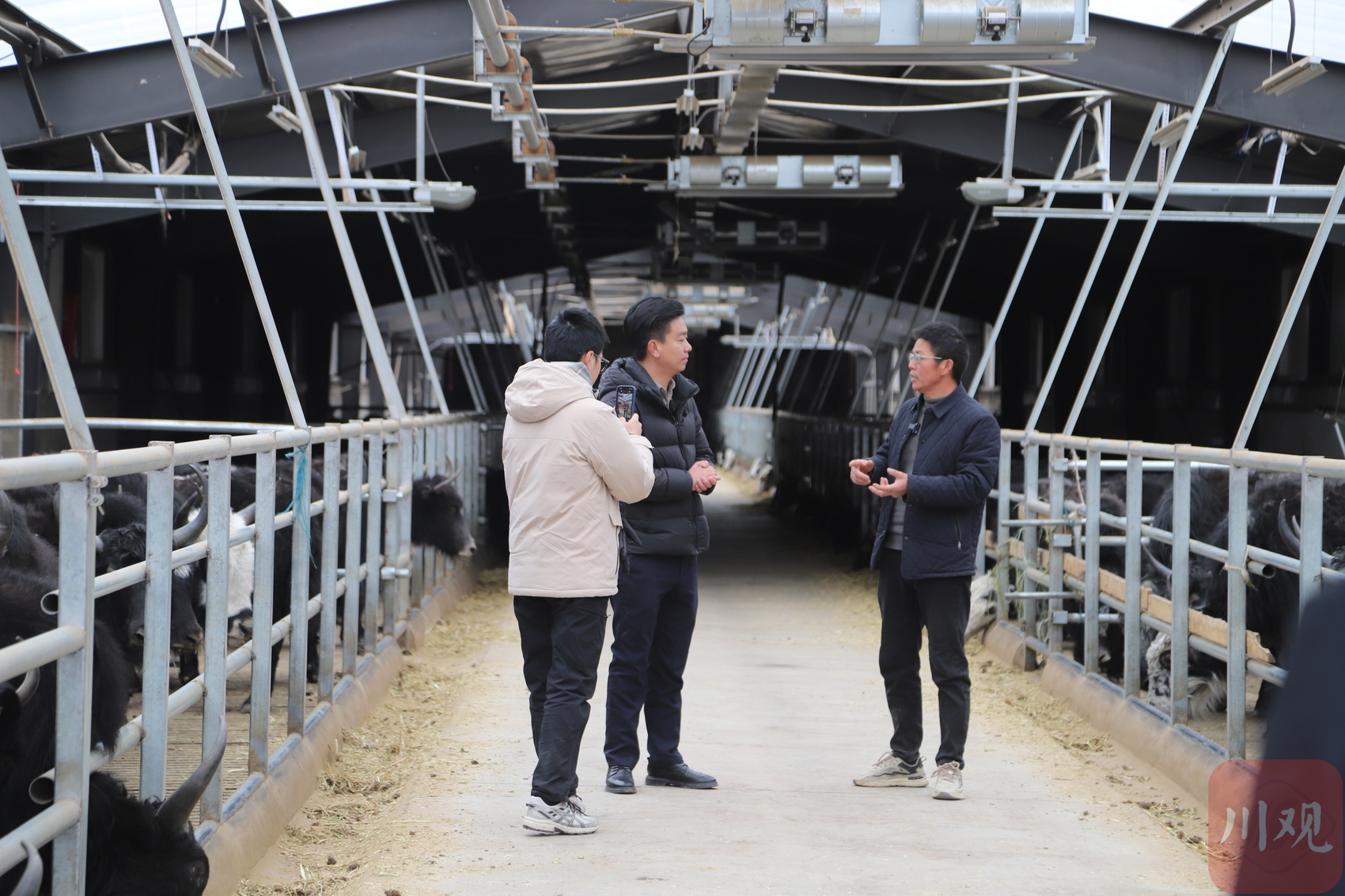 走进牛舍,只见一头头牦牛毛色油亮、体格壮硕,有的两两抵角嬉斗,精气神十足。我们看出了点门道,牛舍保温效果好。熊孝斌的介绍,让我们看到了更多“巧思”——热风机智能运转,确保棚内温度寒冬如春;通风机根据氨气、硫化氢、二氧化硫等浓度自适应调节,保持空气清新干爽;饮水器保持23℃恒温,让牦牛喝上不伤肠胃的温水;牛粪则通过槽沟落入传送带,及时清理出来。我们忍不住打趣:“这里牛虽多,‘牛味’却很淡。”