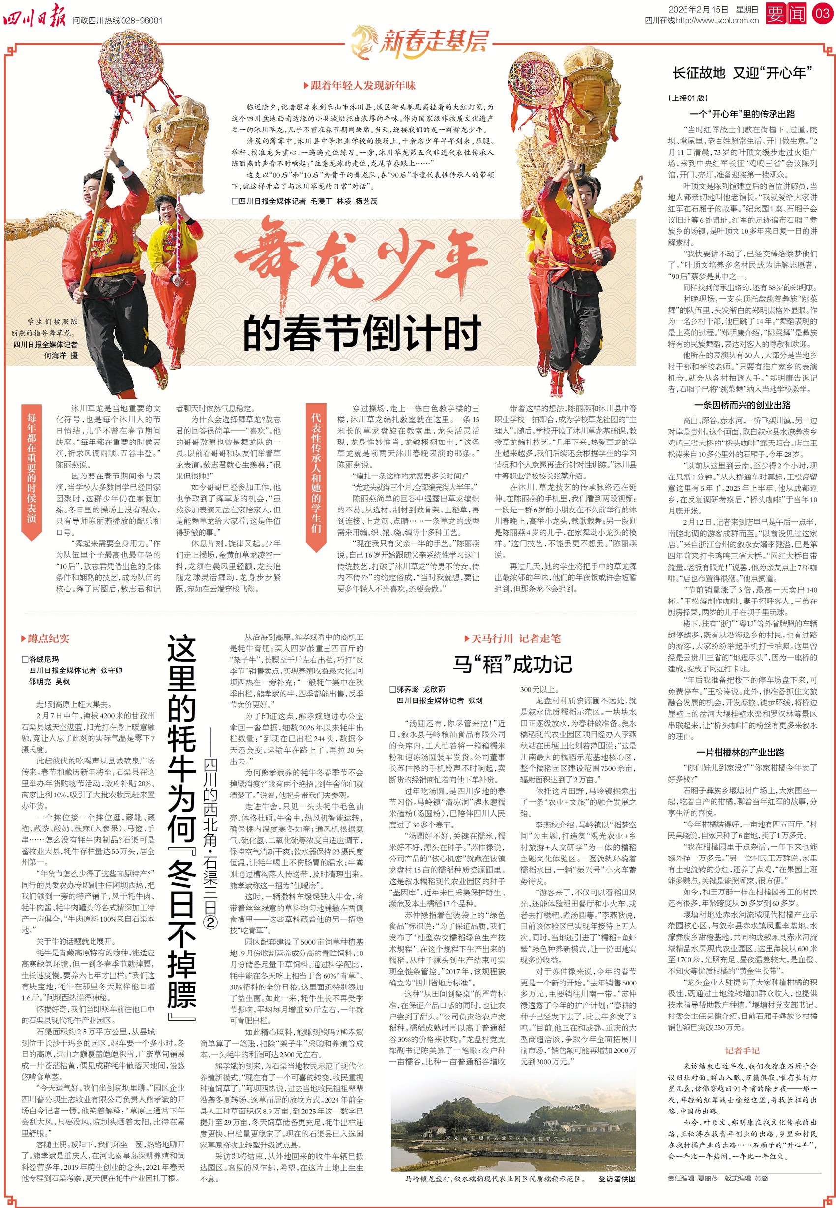 乐山市沐川县,国家级非遗沐川草龙几乎不曾在春节期间缺席。一群“00后”“10后”少年放弃寒假团聚,刻苦训练,只为献上精彩表演。编扎需大半年的草龙,承载着沐川人的节日情结,也在一代代年轻人的坚守中,让千年非遗焕发新生。更多舞龙少年的故事请看今日三版。