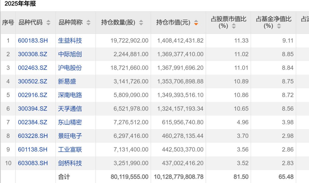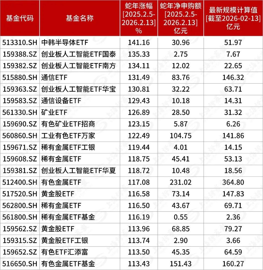 在2月13日收盘后,蛇年最后一个交易日正式结束。公募基金的蛇年业绩表现如何?整体来看,主动权益类基金中位数收益率超过36%,领跑的永赢科技智选混合基金,蛇年收益率高达221.41%。从ETF的表现看,则有35只ETF蛇年涨幅翻倍。从蛇年的交易区间看,从2025年2月5日(蛇年正月初八)开始,到2026年2月13日(蛇年腊月二十六)结束。上证指数在蛇年上涨25.58%,创业板指数上涨58.73%,沪深300指数上涨22.09%,科创50指数上涨53.95%。从基金在蛇年的业绩表现看,整体回报较为抢眼。Choice资讯显示,近4400只主动偏股类基金蛇年的中位数收益率为36.28%,算数平均收益率则高达39.8%。具体来看,蛇年回报超过60%的基金有830多只,回报超过80%的基金接近300只。从业绩抢眼的基金来看,蛇年净值翻倍的基金高达108只,其中永赢科技智选混合基金总回报高达221.41%,夺得蛇年业绩冠军;华商均衡成长混合基金以171.25%的业绩回报夺得亚军;中航机遇领航混合基金以163.23%的收益率位居第三。从公募基金的业绩表现看,在底层市场整体走强的背景下,公募基金的表现可圈可点,重仓科技板块的基金,取得了明显的超额收益。从绩优基金业绩归因看,主要源于把握住了科技板块的行情,业绩领跑的基金,大多源于重仓了AI概念股,尤其是重仓海外算力相关标的。以永赢科技智选混合基金为例,2025年二季度以来,该基金的重仓股,几乎全部是海外算力概念股。截至2025年底,其重仓股持仓情况如下:值得注意的是,过去两年来,ETF爆发式增长,已经成为很多投资者把握投资机会的利器。从ETF的市场表现看,Choice资讯显示,蛇年共有35只ETF取得翻倍涨幅,涨幅最高的中韩半导体ETF达141.16%,国泰创业板人工智能ETF涨幅为135.33%,位居第三的南方创业板人工智能ETF涨幅为134.11%。整体来看,科技主题基金强势领跑,有色金属相关ETF表现也非常抢眼,电网设备、卫星、创新药等主题ETF表现也不错。从资金流向看,蛇年涨幅居前的ETF,吸引了大量资金流入。其中,中韩半导体ETF净申购额超过30亿元,国泰通信ETF净申购额超过80亿元,南方有色金属ETF净申购额则超过230亿元。从最近一个多月来的市场走势看,上证指数确认回到4000点上方,创业板指数高位震荡,不少公募基金净值纷纷创出历史新高。Choice资讯显示,蛇年最后一周交易时间(2026.2.9—2.13)就有近500只主动权益类基金净值创出历史新高。分析发现,这些净值创出新高的基金中,不少是最近一年内收益率翻倍。例如,截至2月12日,红土创新新兴产业混合基金近一年收益率为162.18%,华商均衡成长混合基金近一年收益率为156.63%,基金复权单位净值均创历史新高。此外,华泰柏瑞质量成长混合基金近一年收益率、易方达瑞享混合基金近一年收益率也均超过120%。梳理发现,业绩领先的基金主要把握住了科技板块的投资机会。以张明昕管理的华商均衡成长混合基金为例,其持仓聚焦AI领域,重仓多只光模块龙头。截至2025年底,该基金前十大重仓股包括中际旭创、新易盛、胜宏科技、长飞光纤、源杰科技、东山精密、长盈通、腾景科技等。在AI产业链的投资布局中,林清源管理的平安鑫安混合基金侧重电力设备与新能源基础设施板块,该基金近一年收益率超过97%。从基金重仓股看,截至2025年底,包括应流股份、万泽股份、东方电气、航宇科技、伊戈尔等。除了科技板块以外,部分基金经理凭借对消费领域机会的把握,所管基金净值近期也创出新高。以刘海啸管理的海富通消费优选混合基金为例,近一年收益率超过74%。从基金持仓来看,截至2025年底,前十大重仓股包括潮宏基、春秋航空、燕京啤酒、万辰集团、美的集团等。