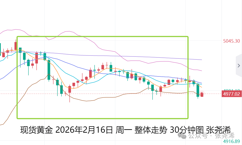 上交易日周一(2月16日):国际黄金受多方地缘局势的谈判预期,以及多国市场休市,而在清淡的交易中走低遇阻回落收跌,短期仍面临一定的震荡调整压力,那么后市来看,在反弹收线至5100美元上方前,先行继续维持震荡波动对待。等待回踩30日或60日均线支撑再度入场看涨。