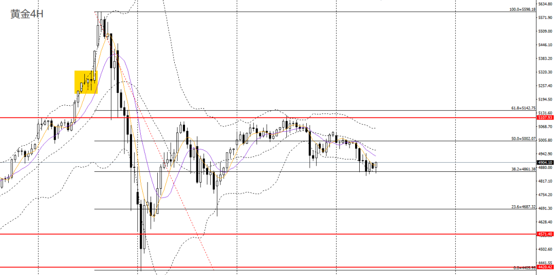 黄金昨日延续阴跌,承压于5日、10日均线,4小时回踩关键支撑4860,短线走势进一步转弱,4950一线承压可进空,后市有望继续下探4780-4800。黄金/人民币如于1100一线承压可进空。