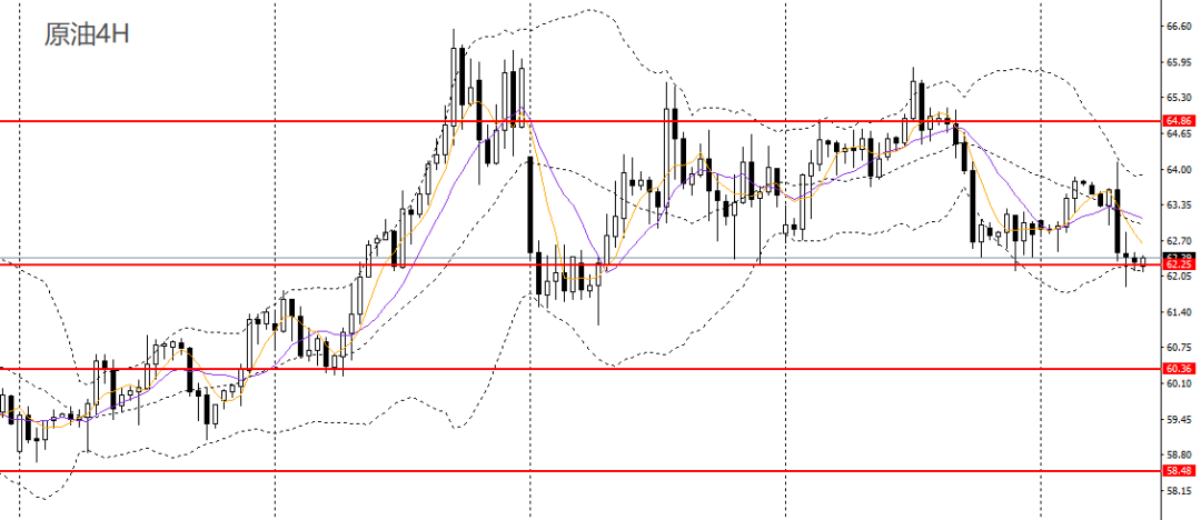 美原油周二深度跳水,刺破62关口支撑,4小时呈头肩顶,短线趋势转弱,如于63附近承压可进空,如彻底下破62,可看空至61.50,61。