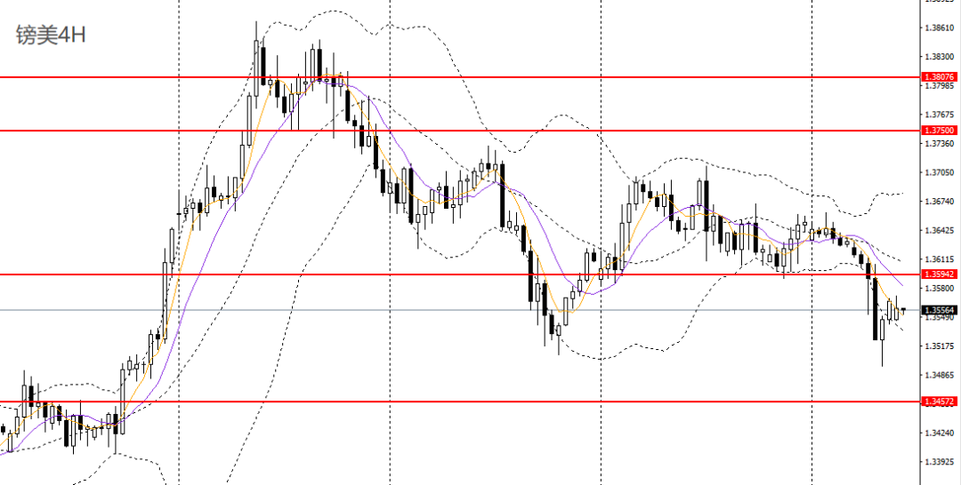 镑美昨日探底回升,刺破前低,4小时下破1.36关口支撑,走势极为疲软,但1.35一线存在一定支撑,空头力量减弱,如继续站稳上方,空单可暂时离场。
