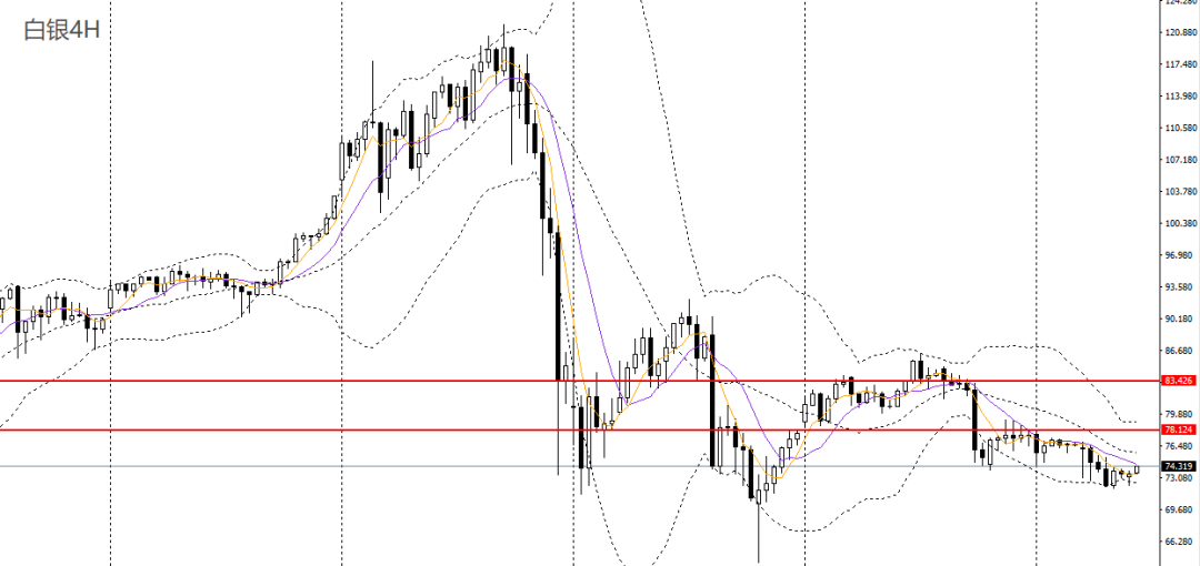 白银周二持续回落,日线RSI位于50下方,4小时呈圆弧顶,空单可继续持有,如失守72关口,可继续看空至70。