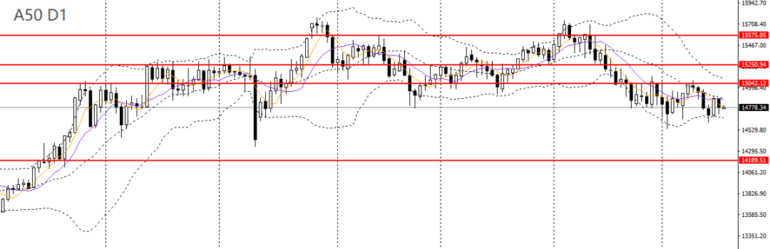 A50昨日小幅回落,日线RSI位于50之下,4小时维持14500-15000区间震荡走势,短线方向不明朗,可暂时观望。