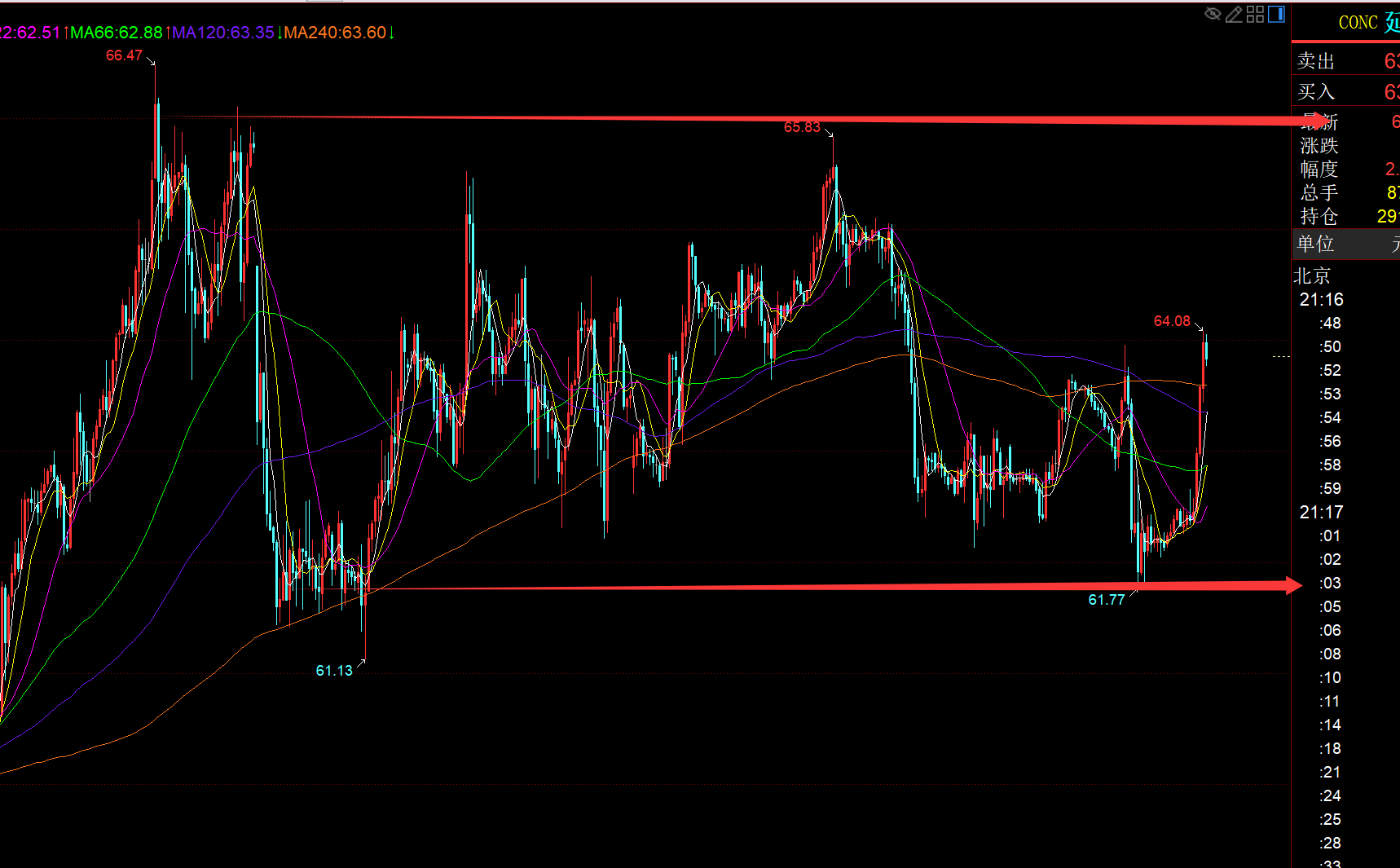 原油方面:这两日暂时没好的通道,就以箱体整理来对待,62-60支撑,64-66阻力,上下震荡对待;