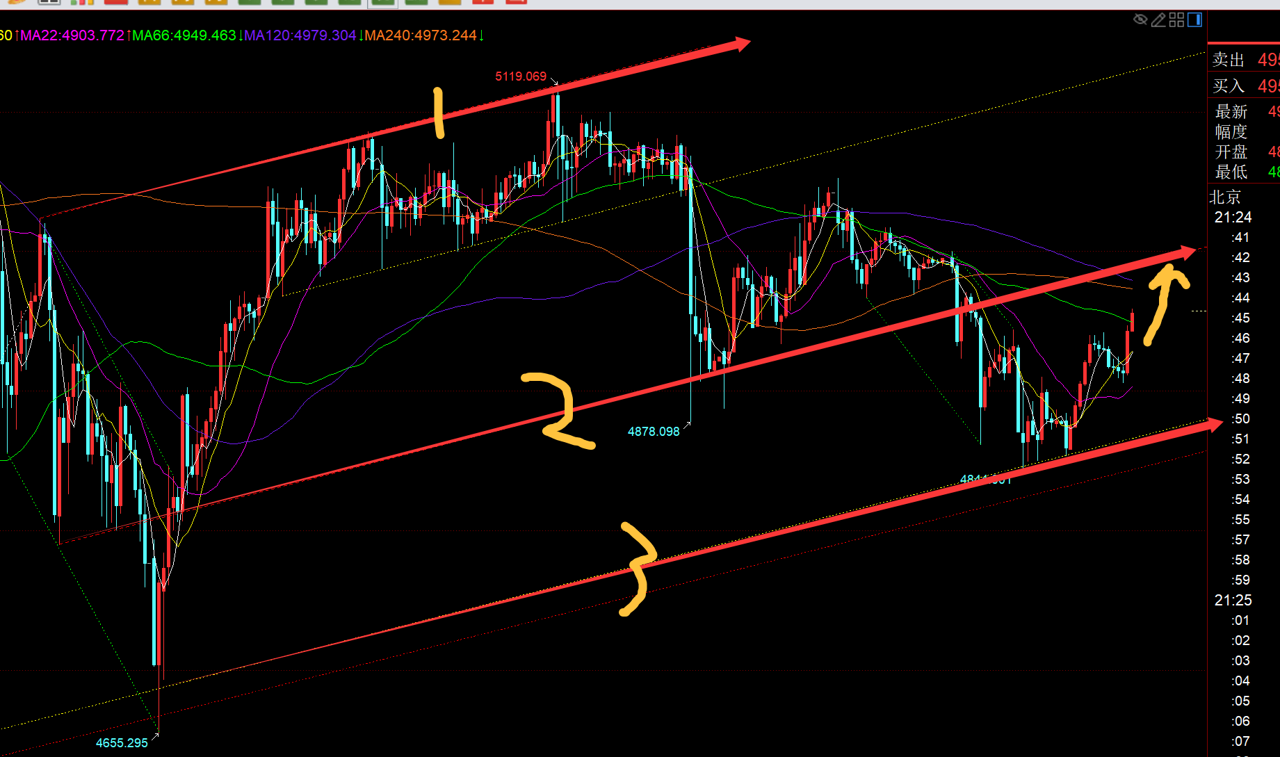 第二,黄金小时线级别:今天早间触及4953企稳,一路连阳拉升,有些小单边的走法,欧盘承压昨晚最后一次开跌口4944,出现滞涨横盘的迹象,则就容易回落修正一波,也顺利抓了一波回踩,本来提示了4910是顶底转换支撑,触及稳定可延续拉升,但还是相对保守去尽量靠近中轨4900及下再去尝试北上,结果就踏空了,最低4906;那么此时再度破日内高点,今晚就要回踩找位置继续北上,关注两个支撑,一个是顶底4940附近,一个是4924,618或短期均线位置,阻力目标往上是4970下一个开跌口,再往上是4990-5000靠近红色通道2号线反压点;