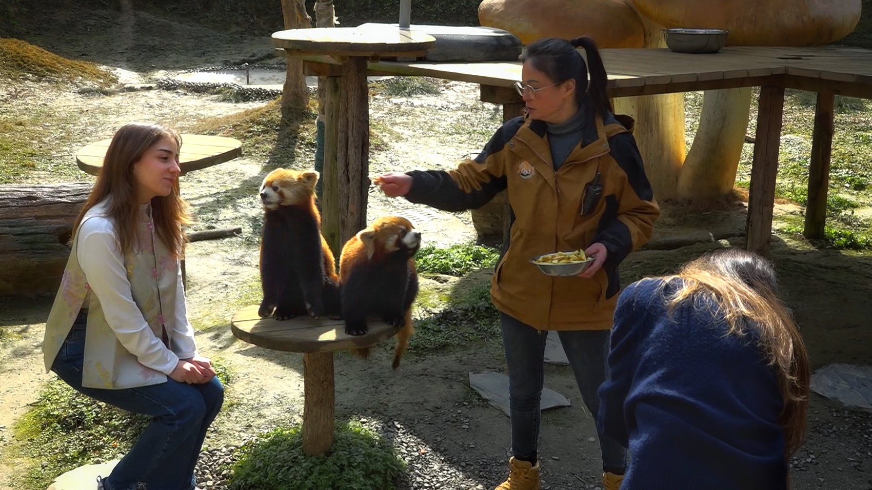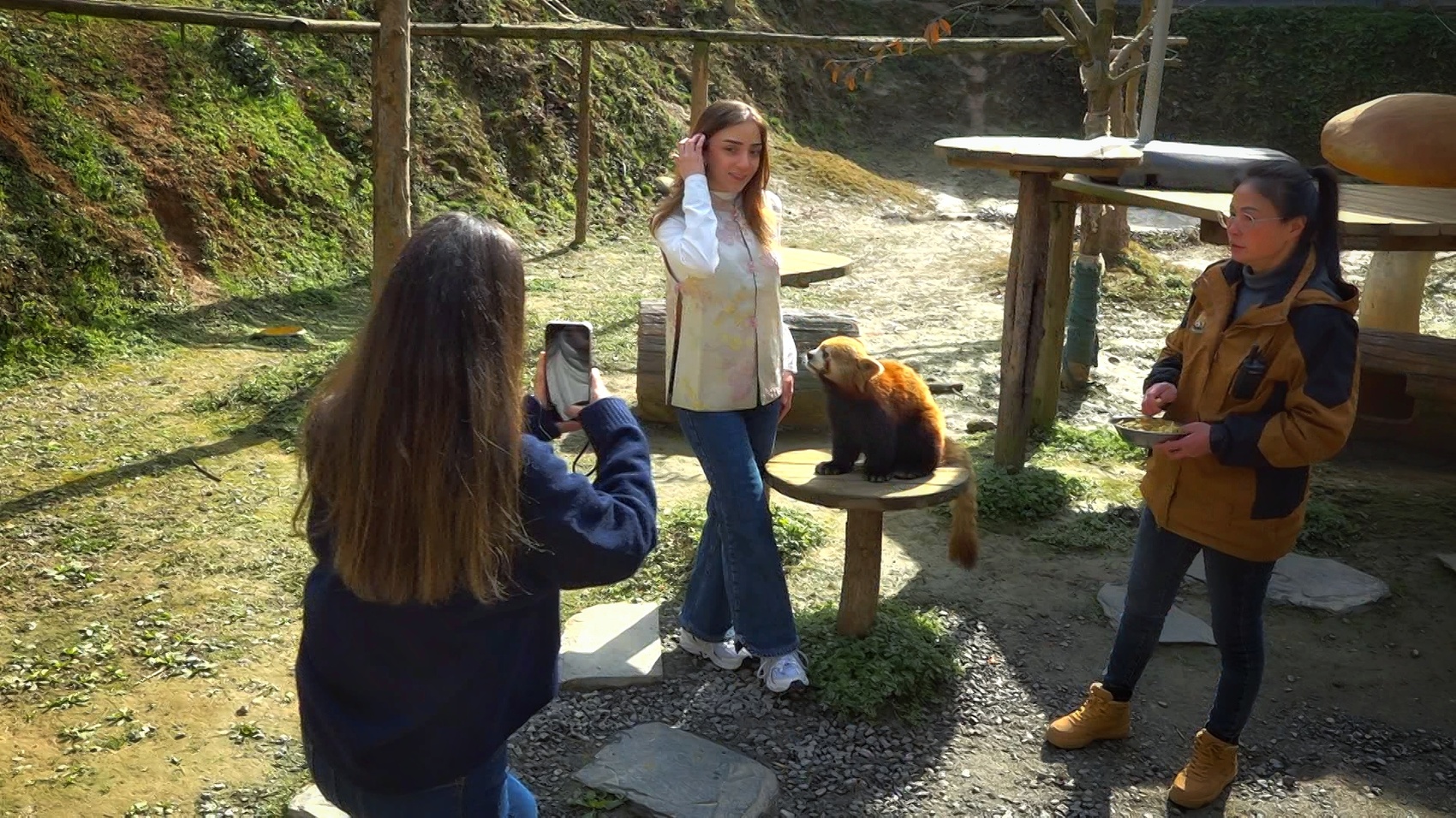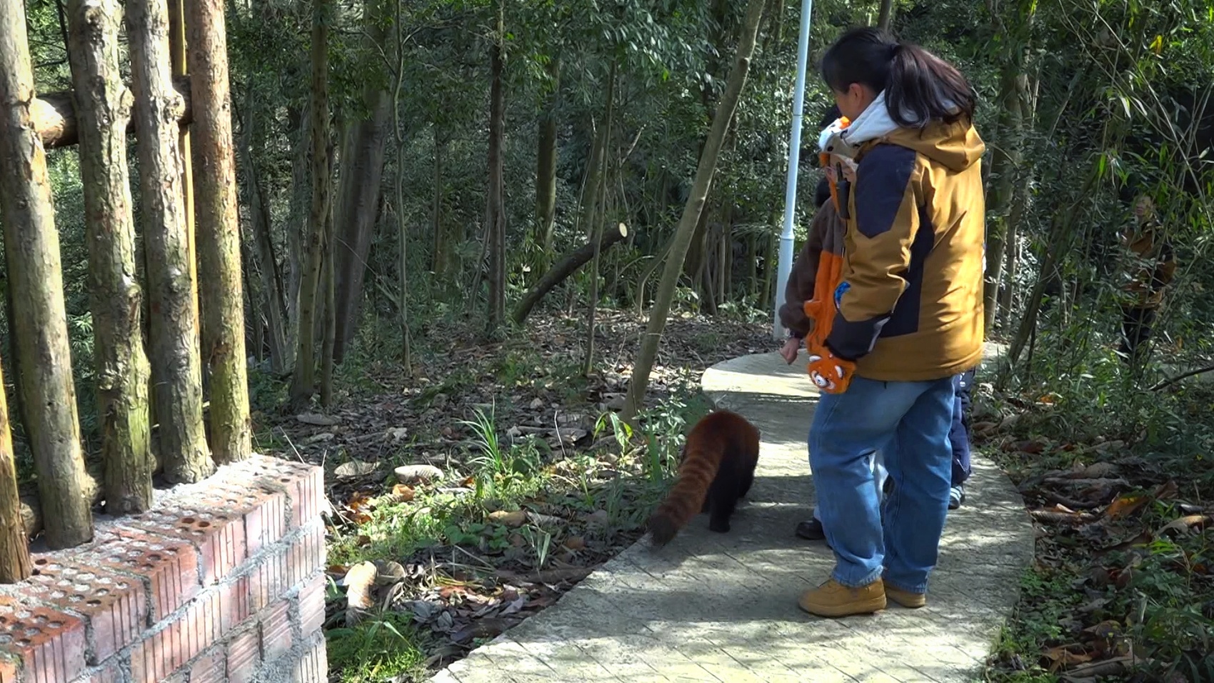 都江堰小熊猫森林公园春节人气火爆,浣熊与小熊猫软萌互动,吸引众多市民游客前来体验乡村自然野趣。