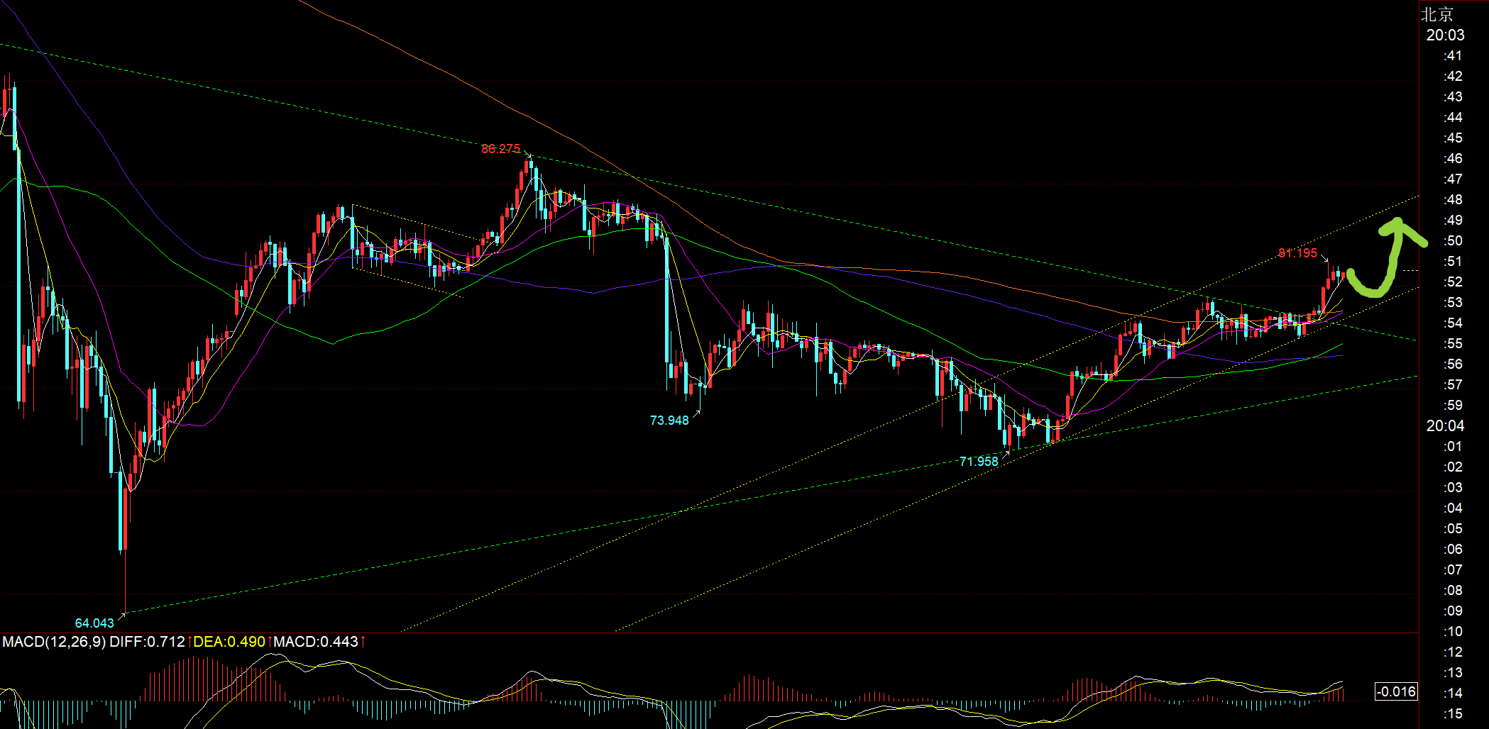 白银方面:今日白银拉升力度可以,欧盘持续破高,走出了底部绿色收敛三角整理,向上突破,当前步入黄色上行通道内;日线级别也有望突破站上短期均线,那么下周就有希望冲击86,92等前期几个开跌口;今晚支撑留意79-78.5顶底和通道下轨企稳北上;