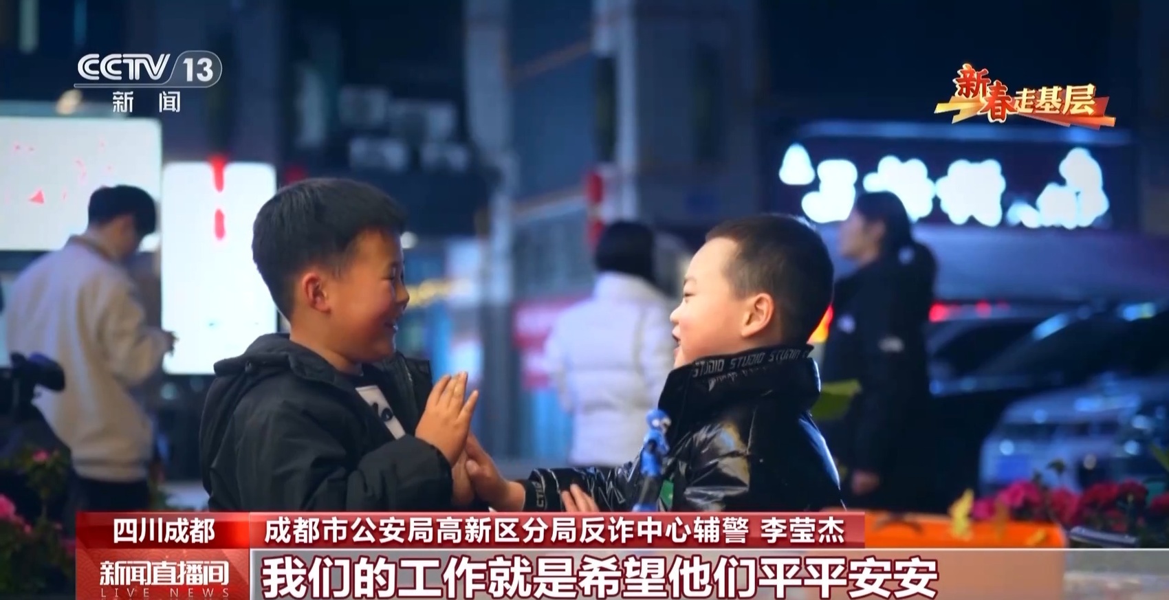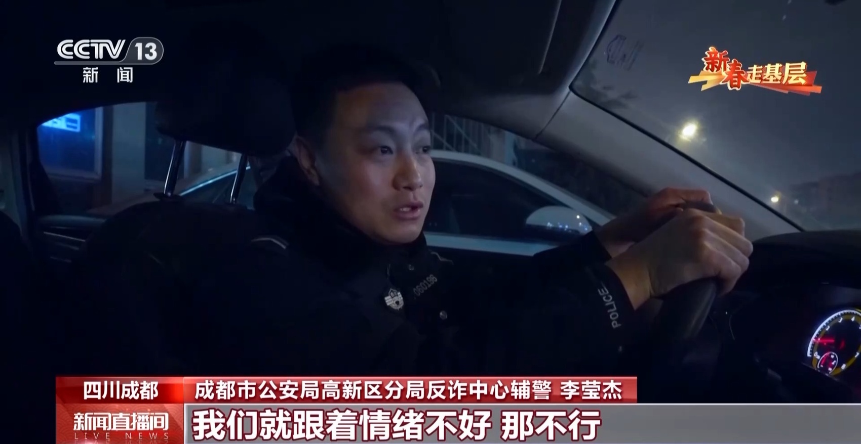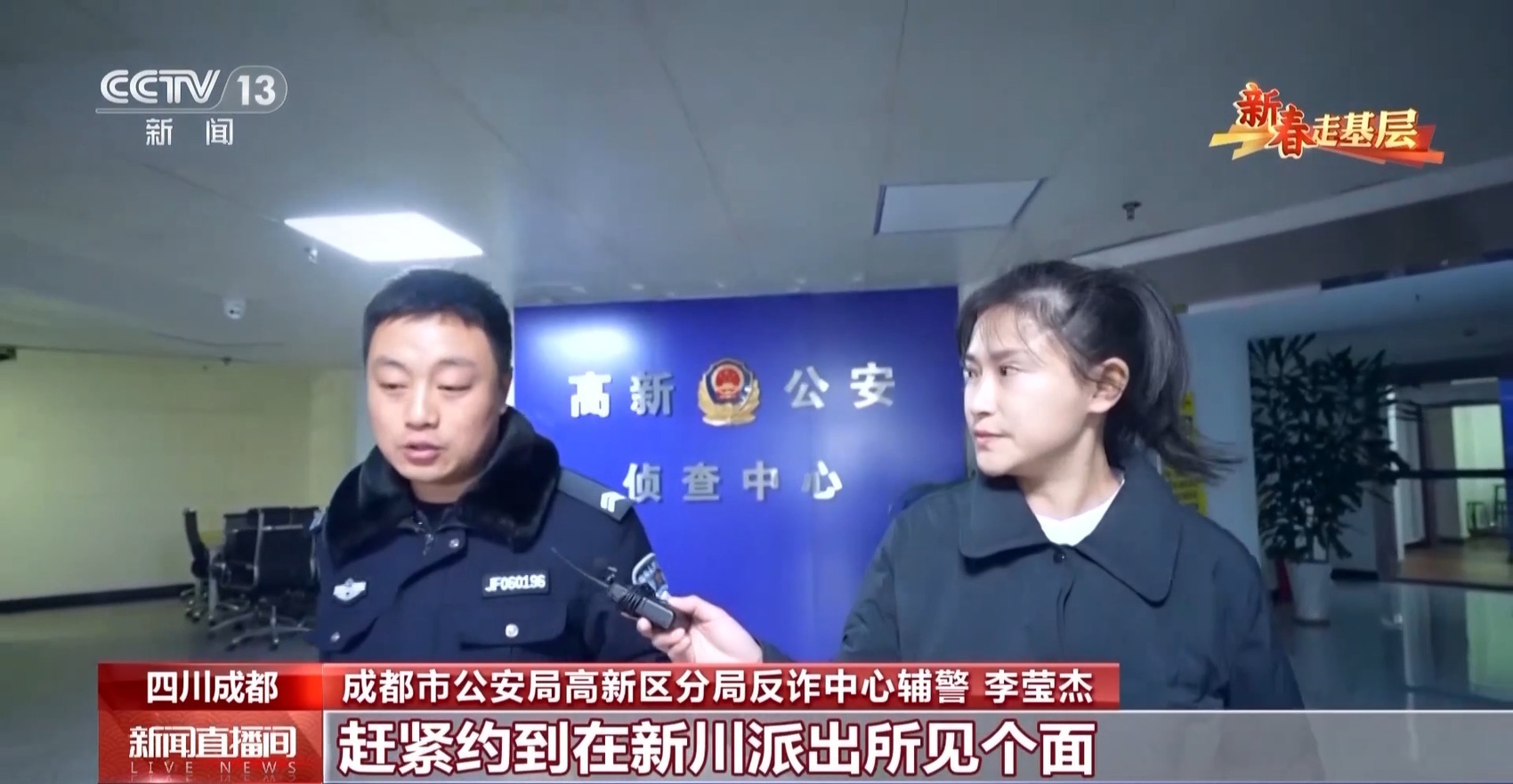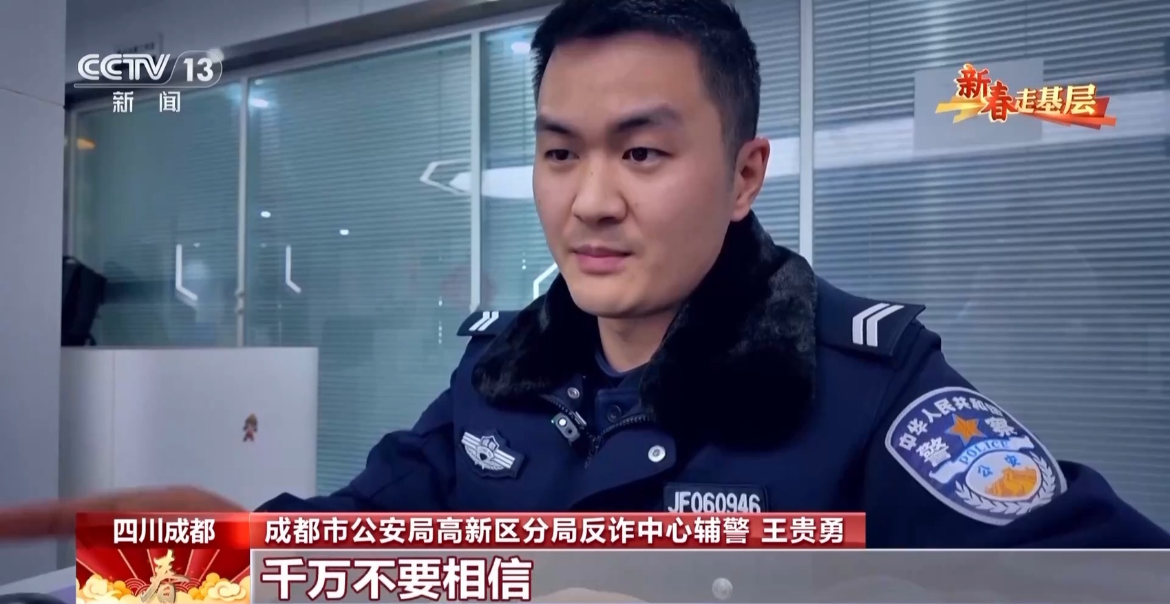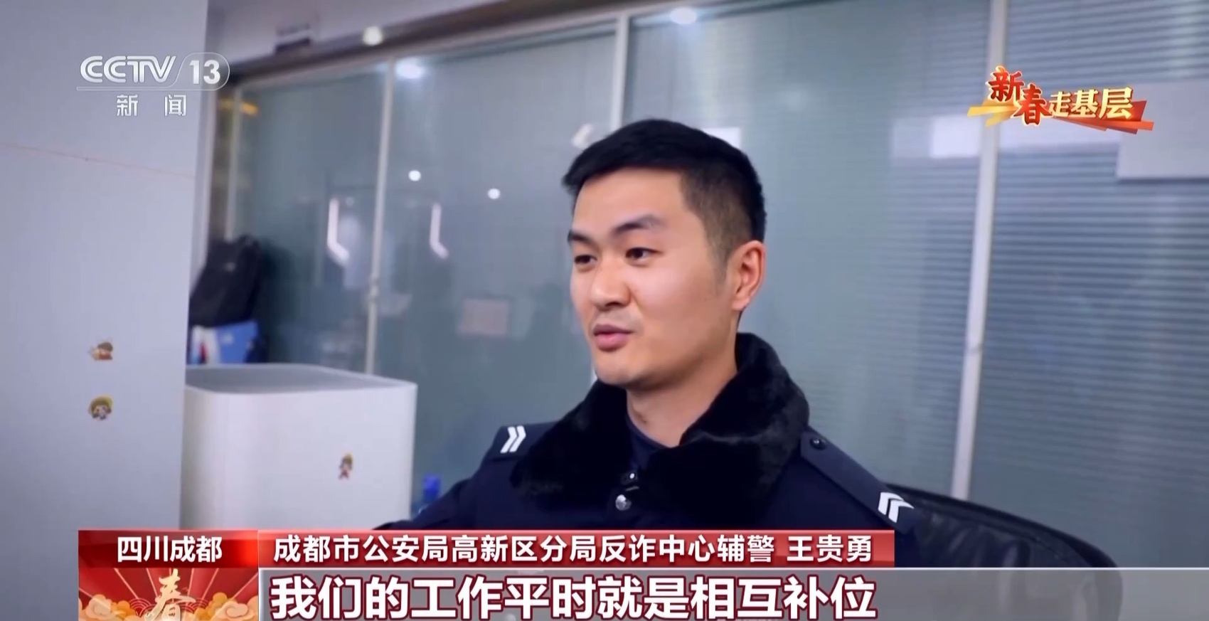 成都市公安局高新区分局反诈中心辅警 李莹杰:你看这外面的老百姓走路有说有笑的,觉得他们挺幸福,这就是我们想要的结果,这就是我们的工作动力。我们的工作就是希望他们平平安安,每天快快乐乐、笑口常开。