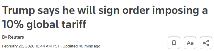 特朗普表示,他将签署一项行政令,在最高法院否决其使用紧急法律工具重塑全球贸易格局后,改以《1974年贸易法》第122条为依据,对全球征收10%的关税。特朗普称,新关税将于约三天后开始生效。