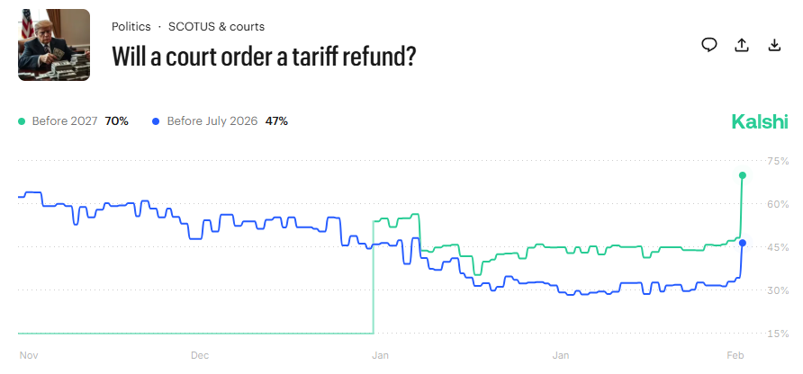 根据预测平台Kalshi,市场目前认为,在2026年7月之前,法院下令特朗普退还关税的概率为70%,较之前的30%左右大幅上升。