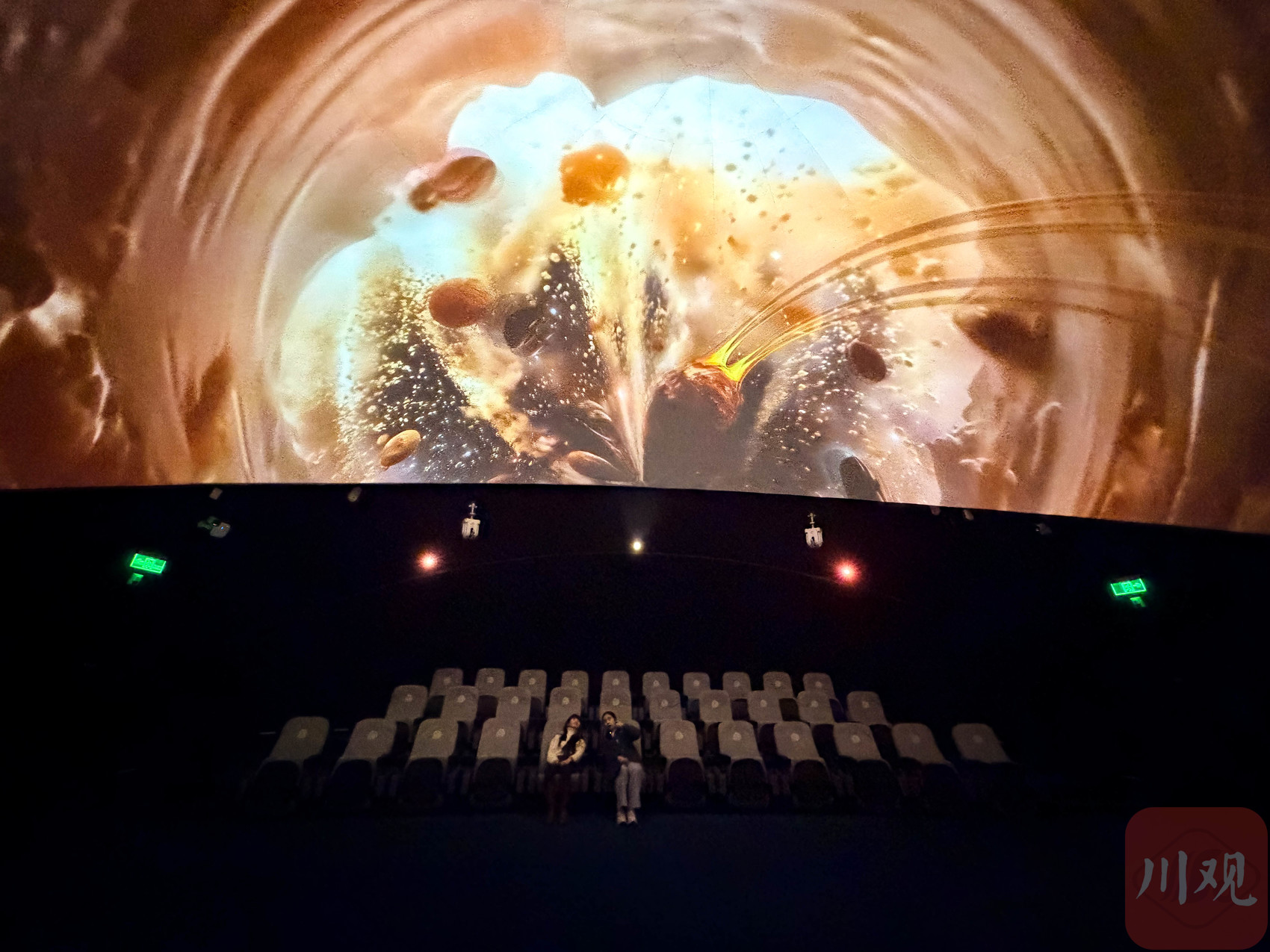 在“崃州馆”,记者佩戴上像耳机一样的风味机,进入圆幕影厅。当影片中出现谷物、巧克力、佳酿的瞬间,对应香气便随之飘散,带来视听嗅多感官沉浸体验。李强 摄