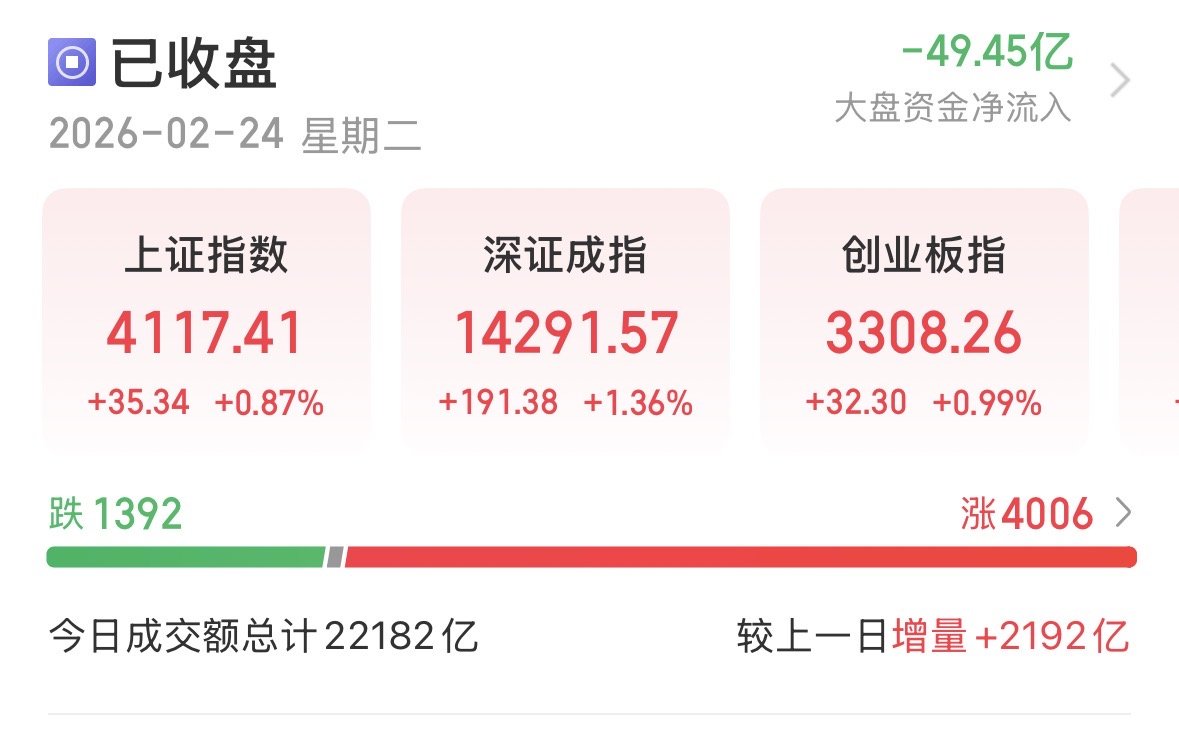 2月24日,A股迎来春节后开门红,三大指数全线收涨。截至收盘,沪指涨0.87%,报4117.41点;深证成指涨1.36%,报14291.57点;创业板指涨0.99%,报3308.26点。全市场成交额突破2.2万亿元,较上一交易日放量超2000亿元,量能显著释放。