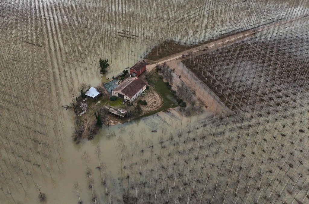 这是2月23日在法国加龙河流域拍摄的被洪水覆盖的地区(无人机照片)。