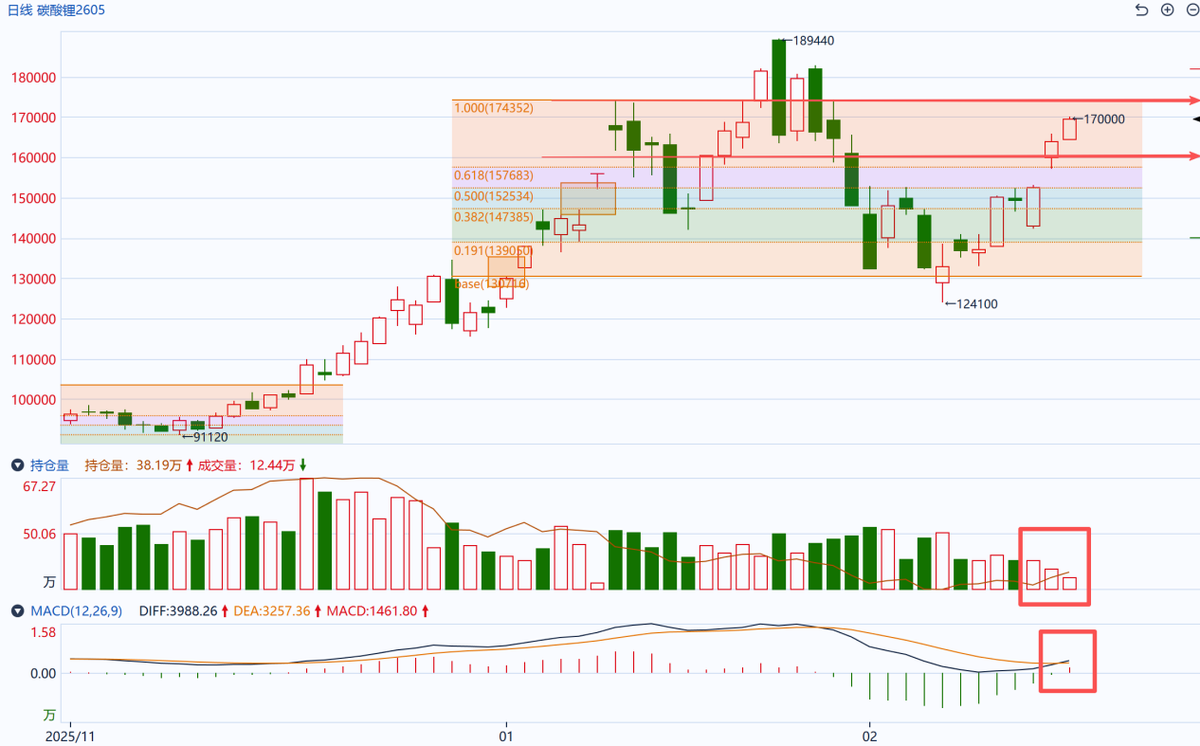 今日早盘,碳酸锂期货延续节后强势,继续领涨商品市场。主力合约LC2605开盘强势上涨,盘中最高触及171000元/吨,日内涨幅5%有余,市场交投情绪极为活跃。