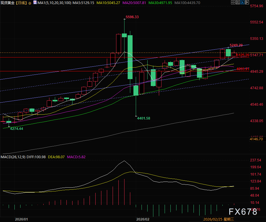周三(2月25日)亚欧时段,现货黄金走出冲高回落走势,受上午特朗普国情咨文对地缘问题短且强硬的说辞,金价得到支撑,但是下午泽连斯基称乌克兰、俄罗斯、美国的谈判可能在三月初举行,受地缘风险消退影响,金价回落,目前现货黄金交投于5168附近,涨0.57%。