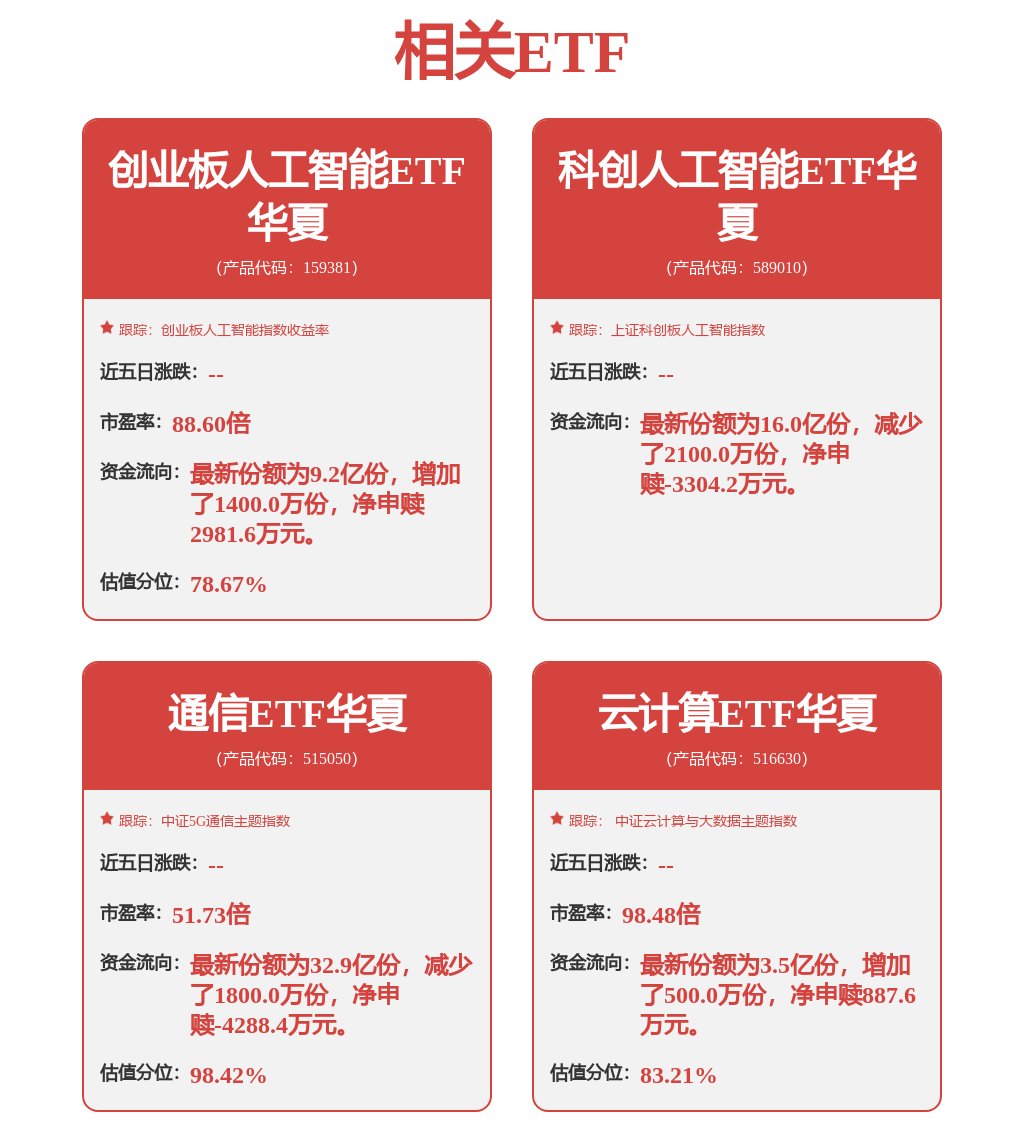 2月26日,三大股指早盘小幅走低,而创业板人工智能指数逆势上行。截至上午10:47,创业板人工智能ETF华夏(159381)涨2.15%,相关持仓股方面,润泽 科技涨13.88%、天孚通信涨9.84%,新易盛、中际旭创、蓝色光标等小幅跟涨。(以上所列股票仅为指数成份股,无特定推荐之意)