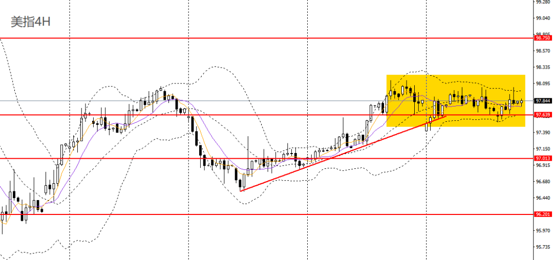 美元指数小幅回升,再度持平前高,4小时重新站上97.60支撑位,上探98关口,短线大概率将延续高位震荡。