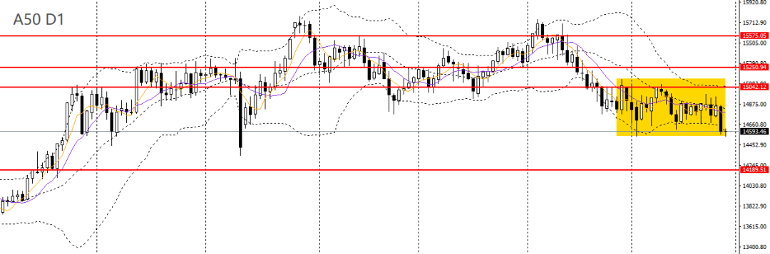 A50昨日深度下挫,刺破日线布林下轨,日线RSI行至低位,4小时触及震荡区间下沿14500一线,后市有望摆脱震荡格局,空单可继续持有,如彻底下破,可看空至14300附近。
