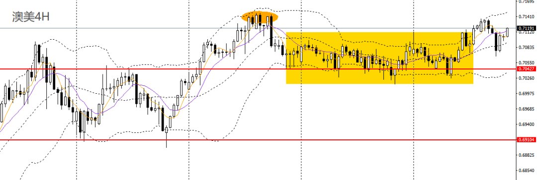 澳美周四收十字星,4小时一度逼近关键平台阻力0.7140,但未能有效升破,多头动能减弱,高位谨慎做多,如于0.71关口附近企稳可进多。