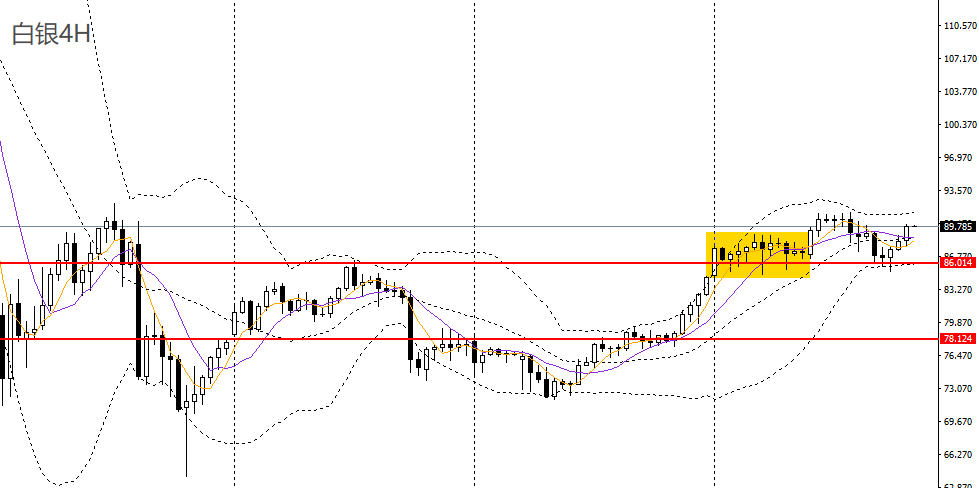 白银昨日收十字星,徘徊于5日均线附近,4小时回踩85-86支撑带企稳,短线走势仍偏强,多单可继续持有,上方首先关注91附近压力。
