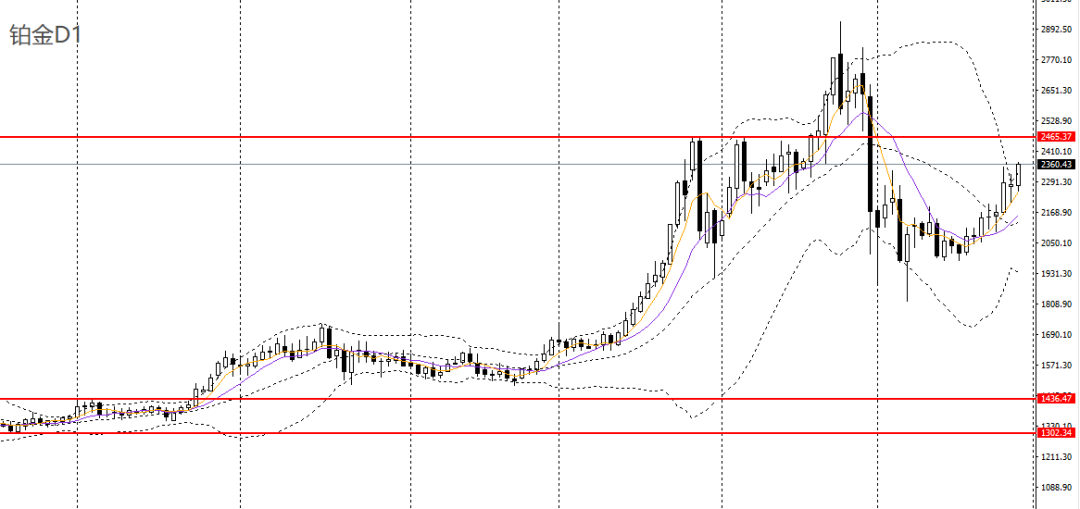 铂金收十字阳线,今日亚盘持续拉升,4小时回踩2200关口支撑附近企稳,走势极为强劲,多单仍可持有,2300-2320一带企稳可进多,如彻底站上2400,可继续看多至2460。