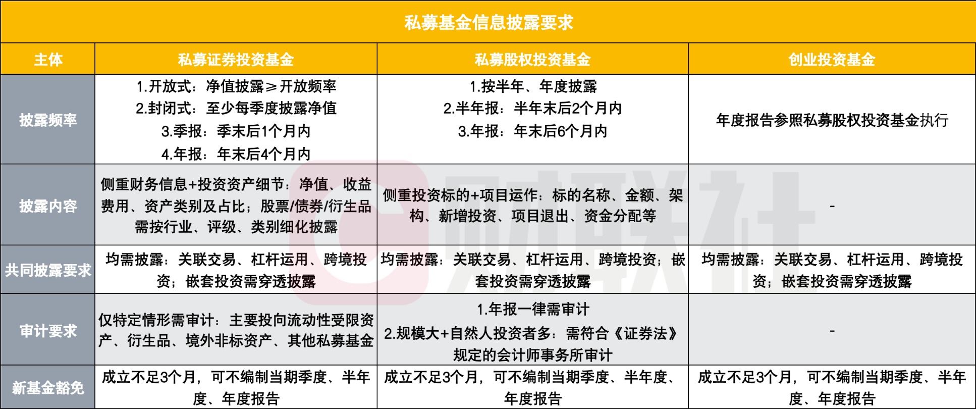 考虑到私募证券投资基金、私募股权投资基金、创业投资基金的运作模式、投资周期、风险特征存在显著差异,《办法》摒弃“一刀切”的披露方式,设置了差异化的信息披露安排,在披露内容、频率、审计要求上作出针对性规定。