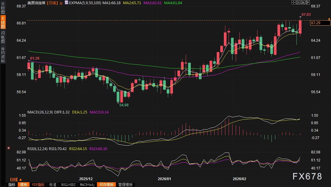 综上所述,本周国际原油市场在美伊核谈判的悬念、美国关税政策的混乱、库存激增的压力以及OPEC+的战略调整中艰难前行。尽管油价短期内可能小幅回调,但只要中东局势不升级,供应中断的风险将持续支撑高位。展望未来,如果谈判最终达成协议,油价或将迎来理性回调;反之,特朗普的武力威胁若成真,全球能源危机将不可避免。投资者需密切关注下周谈判进展和OPEC+会议结果,以把握这一充满不确定性的市场脉搏。汇通财经APP讯——在全球能源格局风云变幻的当下,国际油市正经历一场由地缘政治与经济政策双重驱动的剧烈博弈。美伊核谈判的每一次进展与僵持,都直接牵动着原油期货的神经;美国关税政策的骤然升级,又如同一记重锤砸向全球贸易与能源成本预期。本周,前几个交易日,油价在库存激增与谈判延期的拉锯中反复震荡,周五(2月27日)却大幅上涨近3%,美原油一度刷新近七个月高点至67.83美元/桶,收报67.83美元/桶,周线涨幅约1.48%,月线涨幅2.36%;布伦特原油周五大涨3%,最高触及73.52美元/桶,收报73.12美元/桶,周线涨幅约2.15%,2月份累计上涨4.8%,为连续两个月收涨。