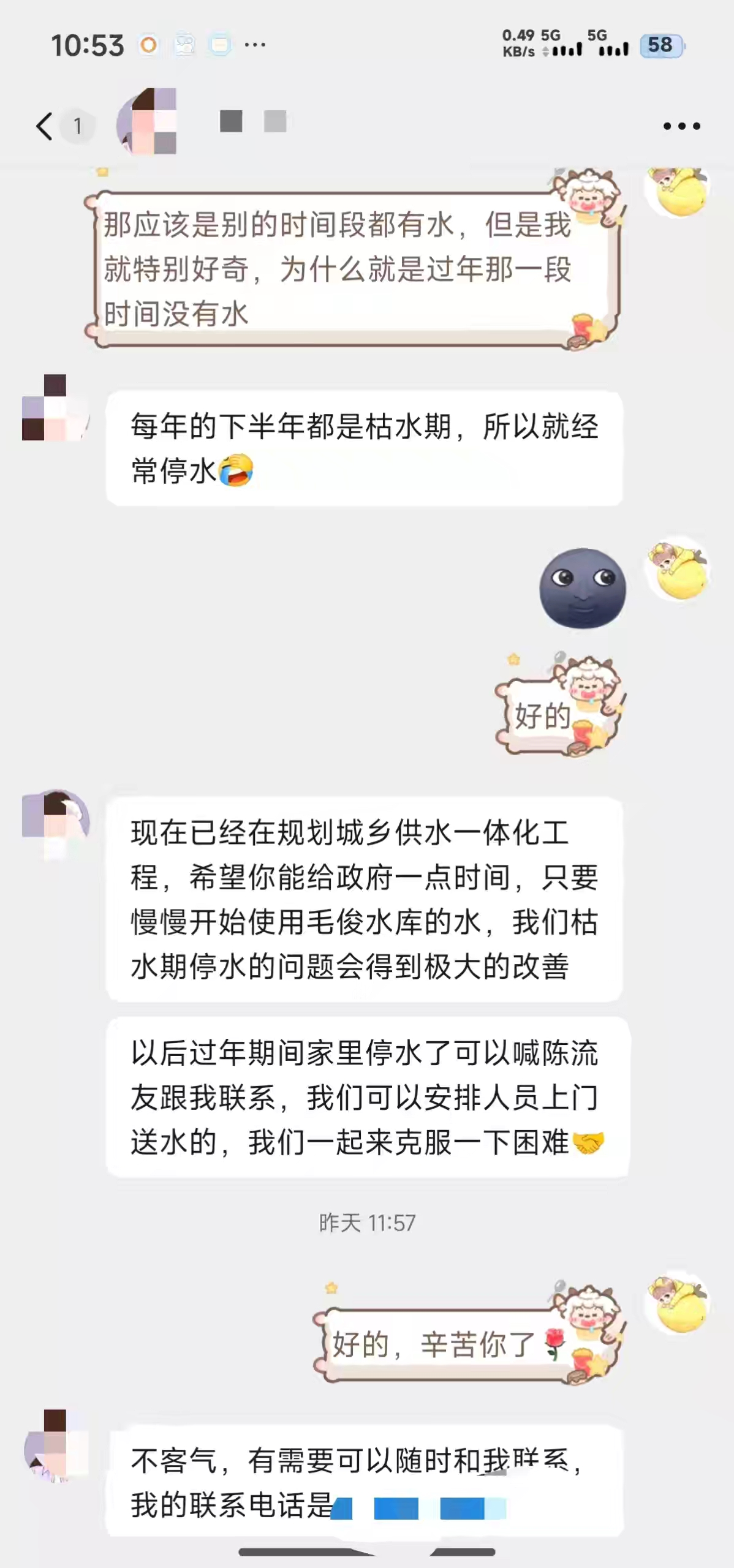 “他们跟我解释了枯水期停水的原因,并且告诉我等慢慢开始使用毛俊水库的水后,这个问题就会改善。”鹤川说,“工作人员还留下了自己的电话,告诉我如果没水了,可以和他联系,他们安排人上门送水。”
