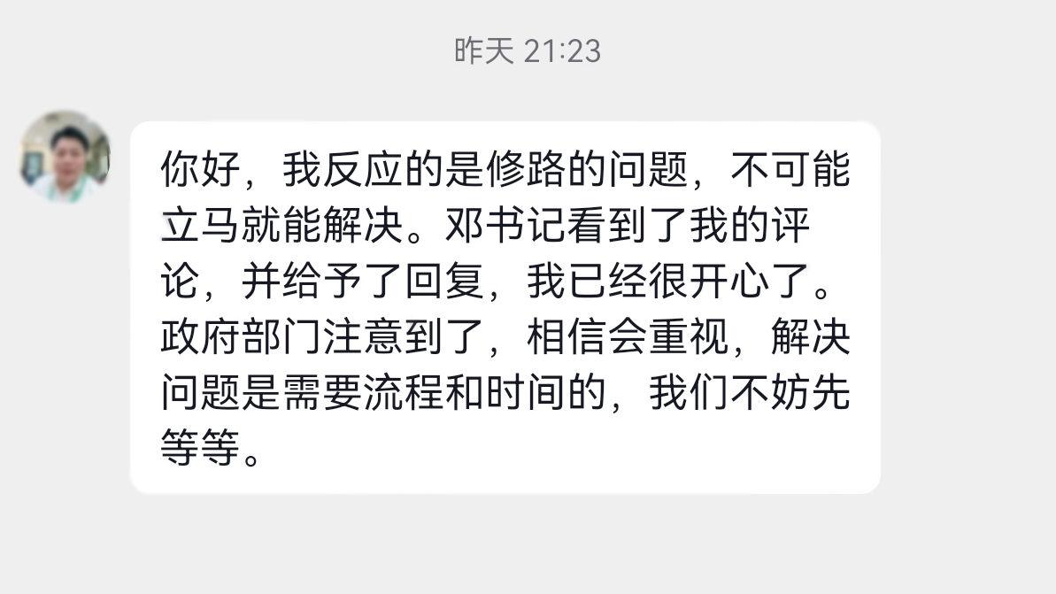“我反映的是村里道路的问题,当地也联系了我,说在想办法解决资金的问题,这是个大工程,不是一两天就能得到解决的。”网名为“鲸鱼入海”的网友告诉记者,“要给政府一点时间。”