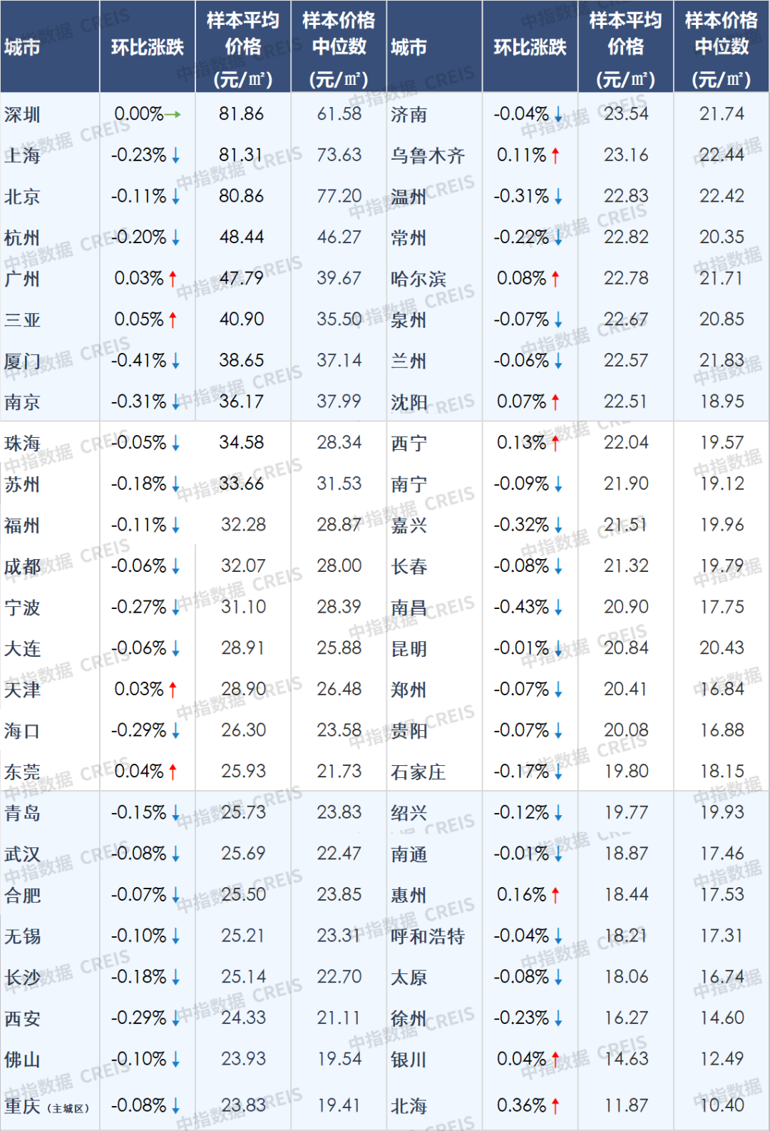 图:50城住宅平均租金及环比变化