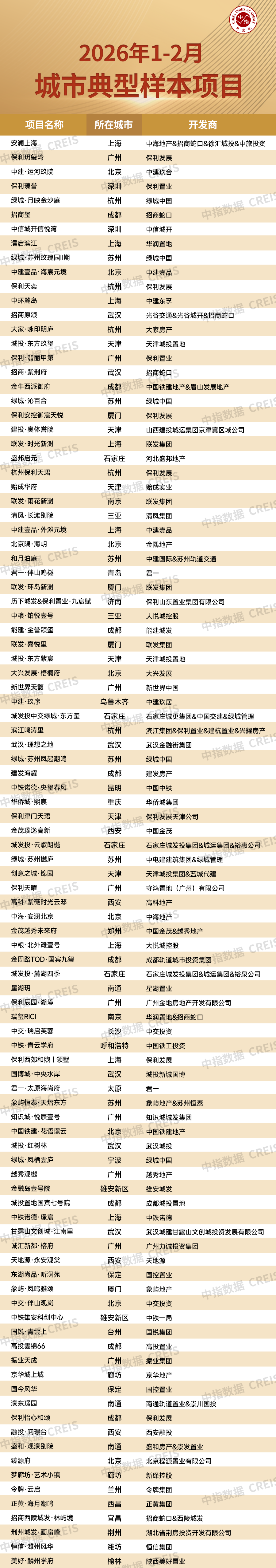 截至2月,全国31个省市两会均已落幕,从各地对房地产工作的部署来看,建设“好房子”已成为一项重要任务。此外,多省市对于“好房子”的表述由2025年的“大力推动”转变为“有序推进”,2026年预计相关工作将平稳推进。在此背景下,中指研究院在中房指数系统理论体系和架构的基础上,从百城价格指数样本项目中选取城市中有较强知名度和广泛影响力的项目,以“典型性”为基本原则,从销售表现、项目品质、品牌实力等维度出发,对主要城市样本项目进行研究,得出“2026年1-2月城市典型样本项目”,为行业提供标杆典范。