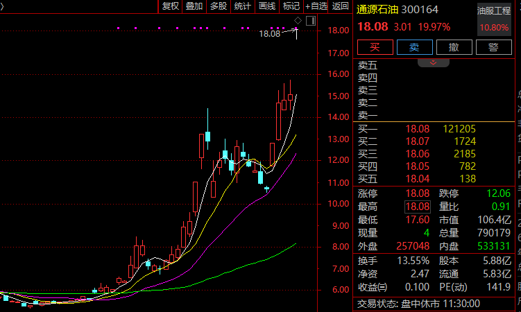 石油产业链早间全线跳空大涨,油服工程方向领涨,板块指数飙升逾10%,创近9年新高。罕见板块内所有个股涨停,科力股份临近午间收盘最后约2分钟30%涨停,股价创历史新高(复权,下同),通源石油则开盘20cm封板,股价同样刷新历史纪录,潜能恒信、中海油服等纷纷强势涨停。