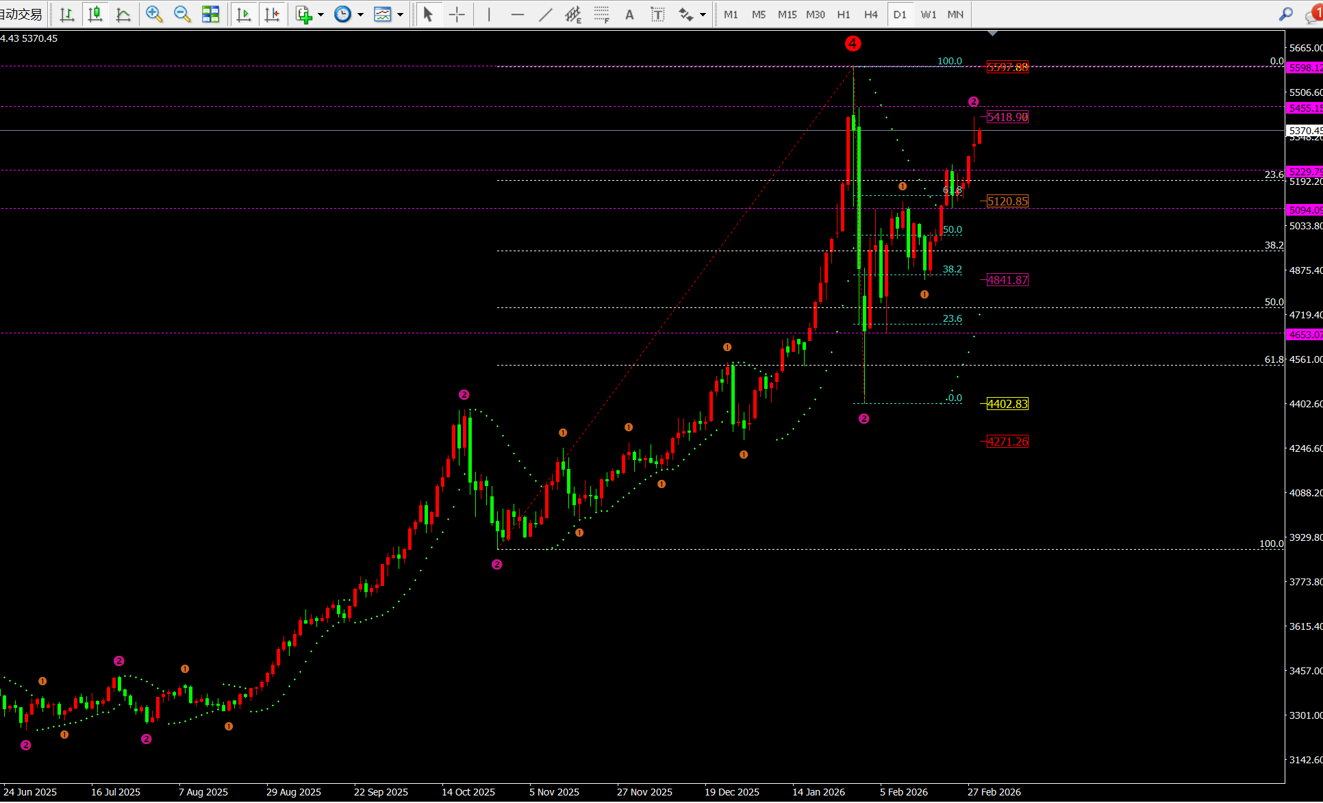 ① 日线昨日以十字星高位收线,而指标macd金叉放量运行,灵动指标sto超买运行,代表十字星的加速走势。但是想要加速成功今日就必须是以大阳拉伸破位十字星的高点,如果是这样走势那么明日就会直接冲击前期高点5600一线。
