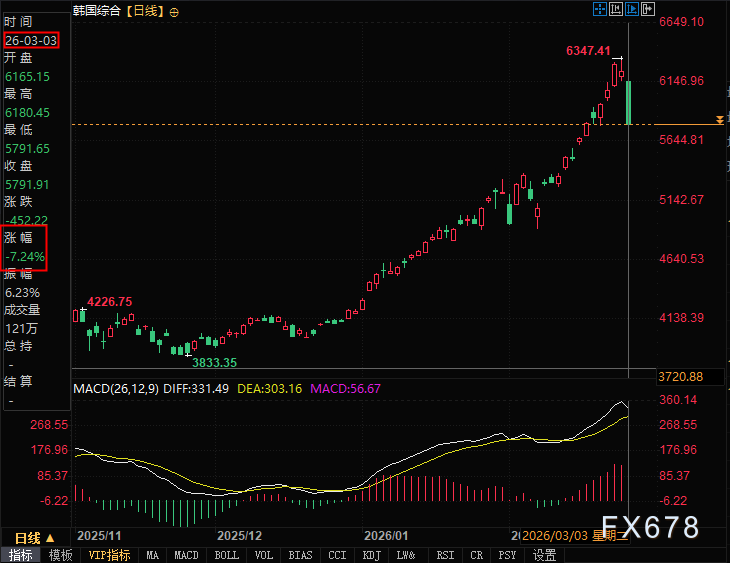 市场情绪最终崩溃,KOSPI指数短期跌幅超过5%,程序化交易的止损盘集中涌出,直接触发熔断机制,最终韩国股市单日收跌7.24%。