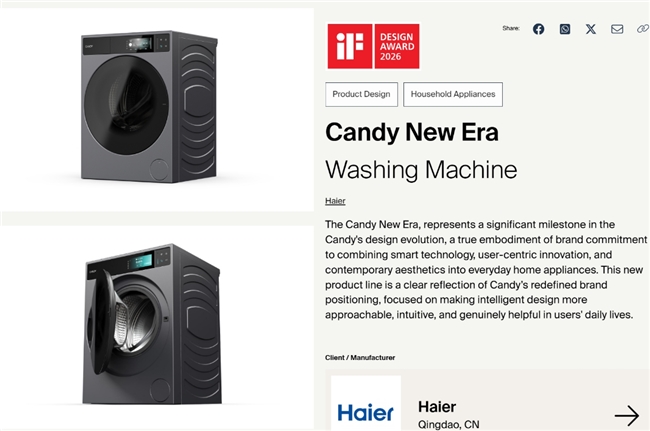 免责声明:家电资讯网站对《海尔智家旗下Candy洗衣机获2026年iF设计奖》一文中所陈述、观点判断保持中立,不对所包含内容的准确性、可靠性或完整性提供任何明示或暗示的保证。请读者仅作参考,并请自行承担全部责任。