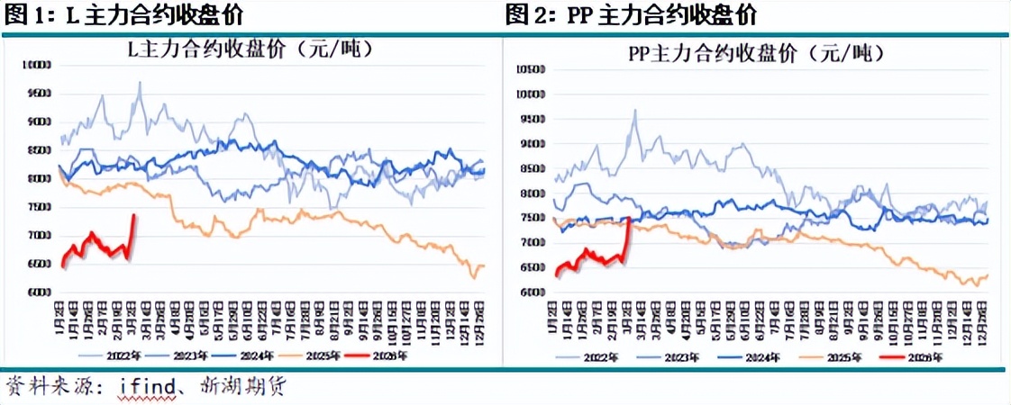 中东局势持续升级,中东多个国家遭受袭击,并且伊朗宣布关闭霍尔木兹海峡,临近的苏伊士运河也同样存在风险,带动原油、天然气以及丙烷等产品的价格大幅上涨。聚烯烃作为下游化工品同样保持了强势运行,截止3月4日收盘,L2605合约价格较2月27日上涨758元/吨,涨幅为11.5%,PP2605合约价格较2月27日上涨895元/吨,涨幅为13.5%,内外盘现货价格同样大幅上涨。