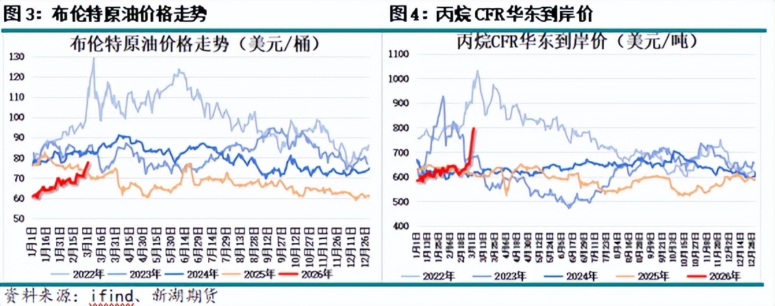 除了航运成本以及运输时间之外,波斯湾地区国家的主要港口基本均位于霍尔木兹海峡以内,霍尔木兹海峡封锁之后,中东船只无法通过海运运输货物,而中东地区的管道运输无法完全弥补海运受阻带来的出口减量。作为全球重要的原油以及化工品出口国,中东地区的运输受阻会导致全球油气相关产品的供应出现缺口,带动原油以及液化气等产品价格大幅上涨,布伦特原油主力合约价格最高突破85美元/桶,较2月27日收盘上涨了16%,外盘丙烷价格涨幅同样巨大,3月3日丙烷进口价格已经上涨至接近800美元/吨,较2月27日上涨145美元/吨,涨幅达到22%。上游原料价格的大幅上涨带动了聚烯烃成本端的走强。