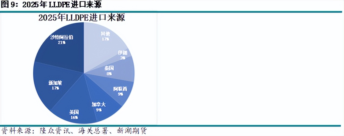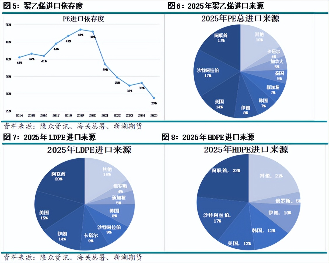 中东地区是我国重要的聚烯烃进口来源。2025年,中国聚乙烯的进口依存度达到将近30%,聚丙烯的进口依存度较低,仅为7%,因此相对而言对于聚乙烯的影响会更大。中国聚乙烯进口中有将近一半的货源是来自于中东地区,其中阿联酋与沙特阿拉伯分别是我国最大的两个进口来源国家,伊朗的占比排名第四。分品种来看,中东地区进口货源对于非标品HDPE与LDPE的影响更大,LDPE的进口份额中来自中东地区国家的合计占比超过50%,阿联酋占比最大,为20%,伊朗占比为14%,HDPE中中东地区国家的合计占比同样在50%以上,其中伊朗占比为10%,相对而言标品对于中东国家的依赖度要低于非标品,其合计进口占比为34%,其中伊朗的占比不到3%。若是霍尔木兹海峡封锁持续较长时间,中东地区货源无法通过海运发货会导致全球聚烯烃供应收紧,进而对国内聚乙烯供应造成较大影响,特别是对非标品的供应。