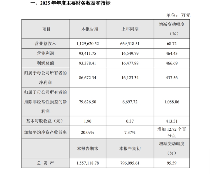 2月28日,公司曾发布业绩快报公告。公告显示,2025年公司营业收入大幅度增长,共实现营业收入112.96亿元,同比增长68.72%;实现归属于母公司所有者的净利润8.67亿元,同比增长437.56%;实现归属于母公司所有者的扣除非经常性损益的净利润7.96亿元,同比增长1088.86%。