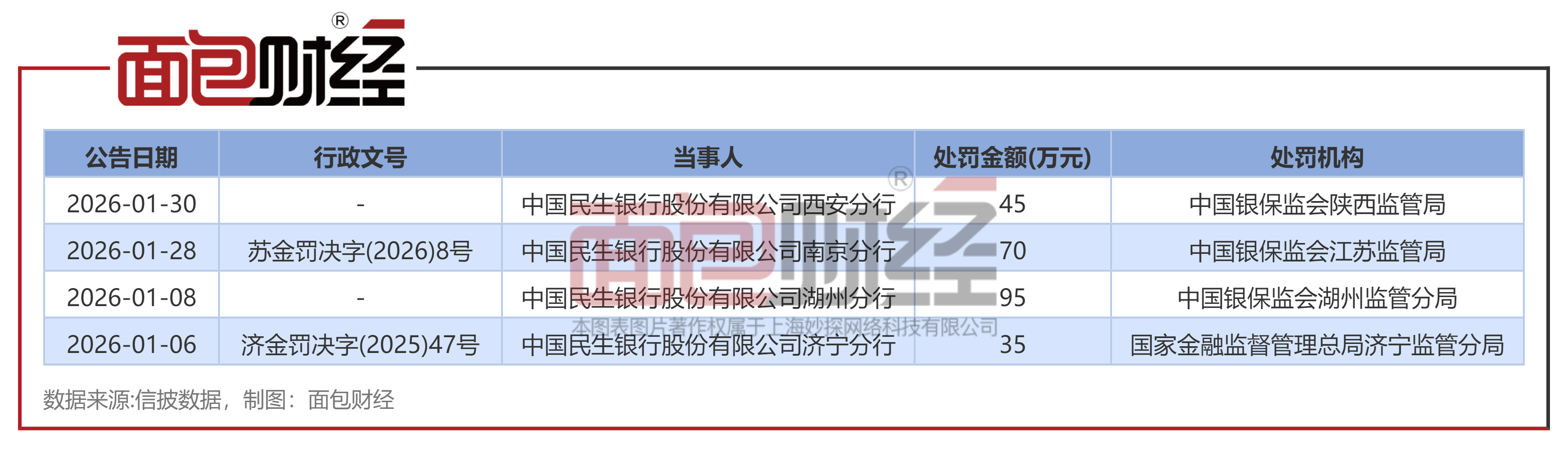 2026年以来,民生银行已收到多张罚单,罚款合计约达245万元。